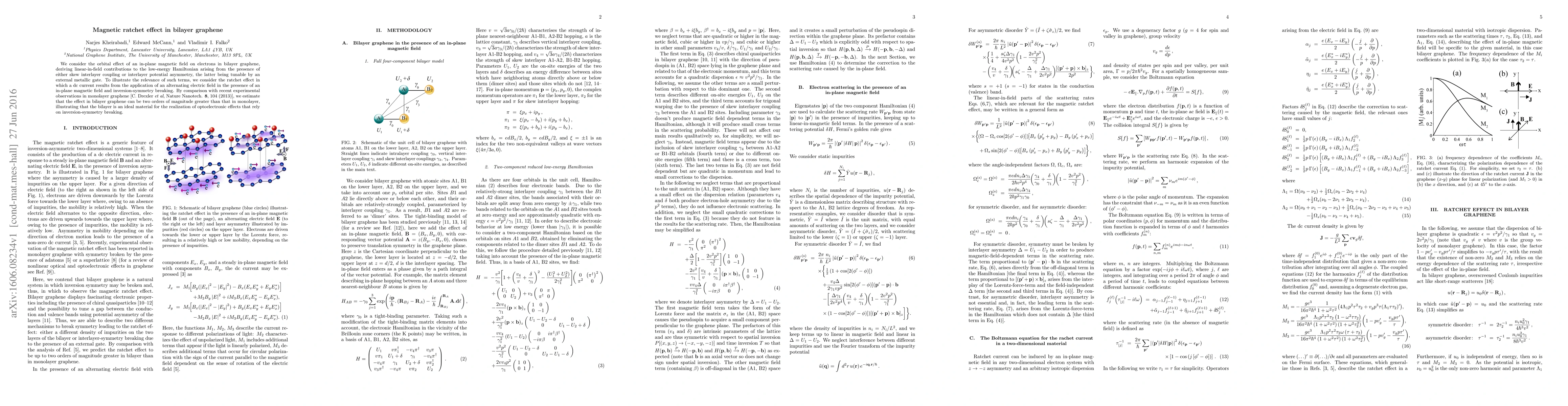 This research explores the magnetic ratchet effect in bilayer graphene, showing that the effect can be significantly stronger than in monolayer graphene due to linear-in-field contributions in the low-energy Hamiltonian arising from skew coupling or potential asymmetry, potentially leading to greater optoelectronic applications. Experimental comparisons suggest bilayer graphene could outperform monolayer graphene by two orders of magnitude in such effects.