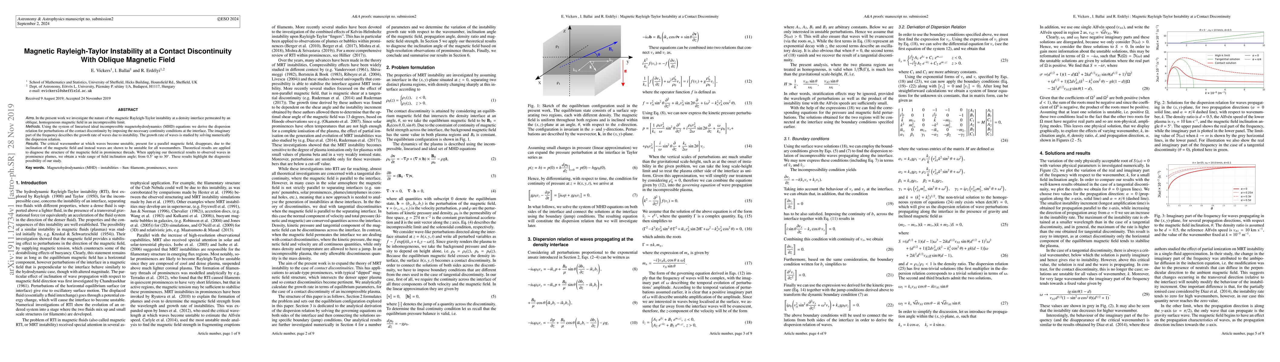 This paper investigates the magnetic Rayleigh-Taylor instability at a density interface with an oblique magnetic field, deriving a dispersion relation and finding that wave instability occurs for all wavenumbers due to the magnetic field's inclination. The study also applies these findings to diagnose magnetic field structures in solar prominence threads and plumes.