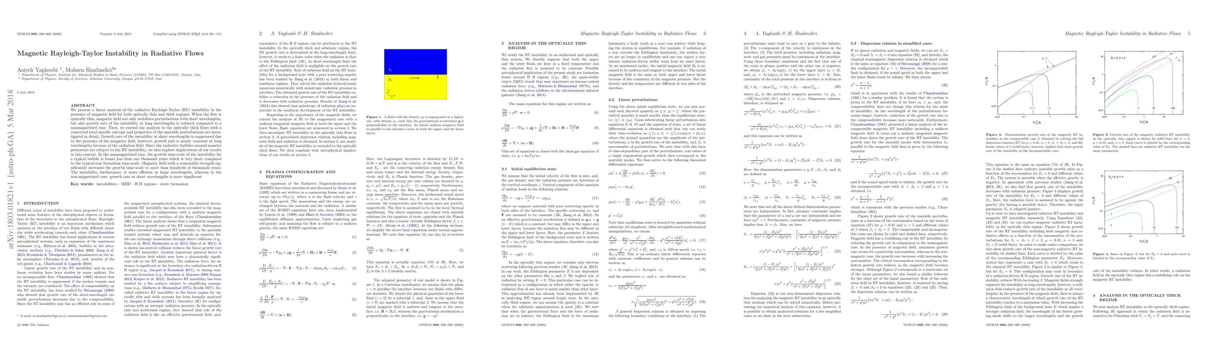 This paper conducts a linear analysis of the radiative Rayleigh-Taylor instability in magnetized flows, showing that magnetic fields stabilize perturbations in optically thin regimes and reduce growth rates in both regimes. The presence of magnetic fields significantly increases the growth time-scale of the instability in radiative bubbles around massive protostars, from less than a thousand years to hundreds of thousands of years.
