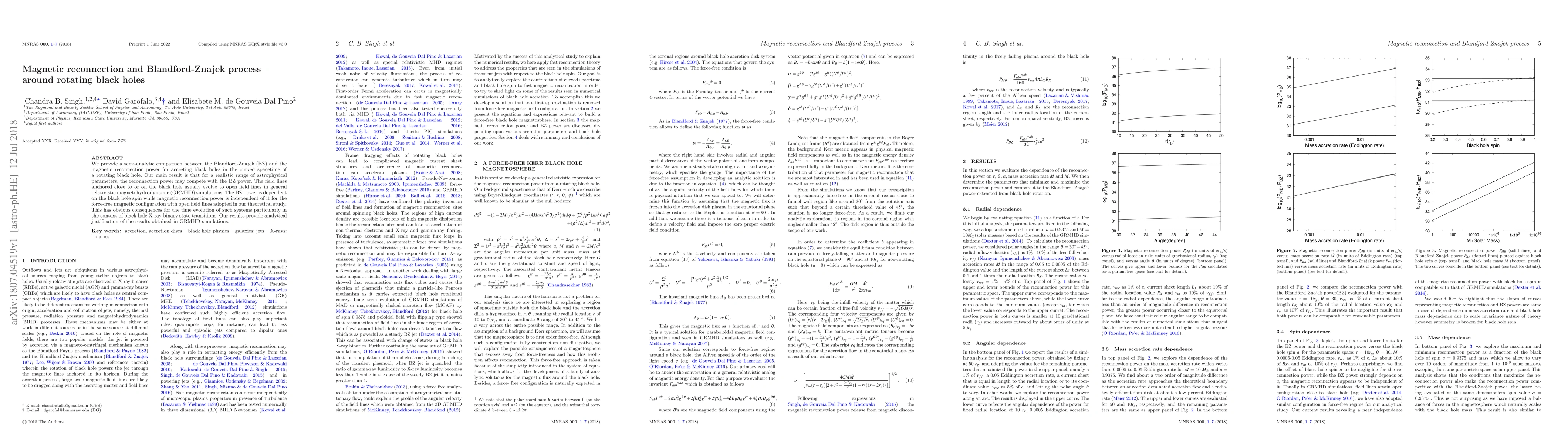 We provide a semi-analytic comparison between the Blandford-Znajek (BZ) and the magnetic reconnection power for accreting black holes in the curved spacetime of a rotating black hole. Our main result is that for a realistic range of astrophysical parameters, the reconnection power may compete with the BZ power. The field lines anchored close to or on the black hole usually evolve to open field lines in general relativistic magnetohydrodynamic (GRMHD) simulations. The BZ power is dependent on the black hole spin while magnetic reconnection power is independent of it for the force-free magnetic configuration with open field lines adopted in our theoretical study. This has obvious consequences for the time evolution of such systems particularly in the context of black hole X-ray binary state transitions. Our results provide analytical justification of the results obtained in GRMHD simulations.