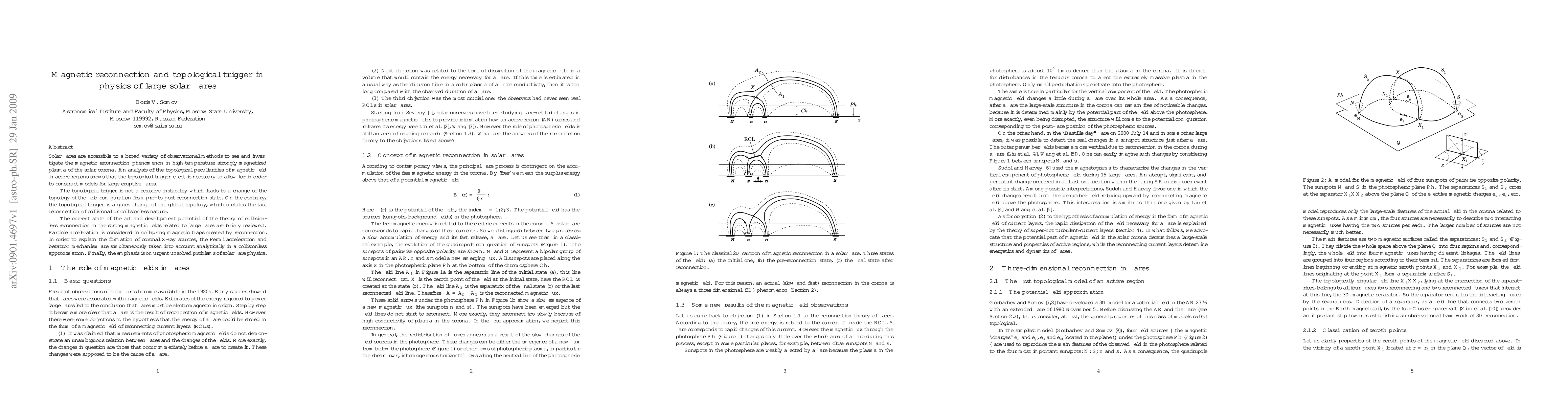 This paper explores the magnetic reconnection and topological trigger mechanisms in large solar flares, emphasizing the necessity of the topological trigger for constructing models of eruptive flares. It reviews the current state of collisionless reconnection theory and discusses particle acceleration in collapsing magnetic traps, highlighting unresolved problems in solar flare physics.