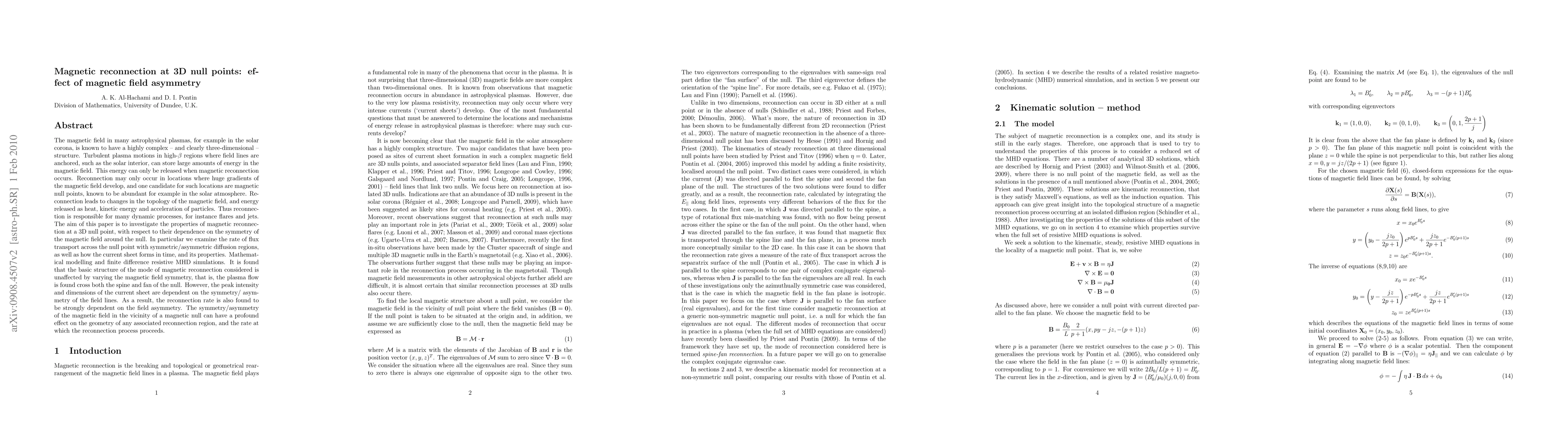 This paper investigates magnetic reconnection at 3D null points, finding that while the reconnection mode remains consistent, the current sheet's peak intensity and dimensions, as well as the reconnection rate, are significantly influenced by the magnetic field's symmetry or asymmetry.