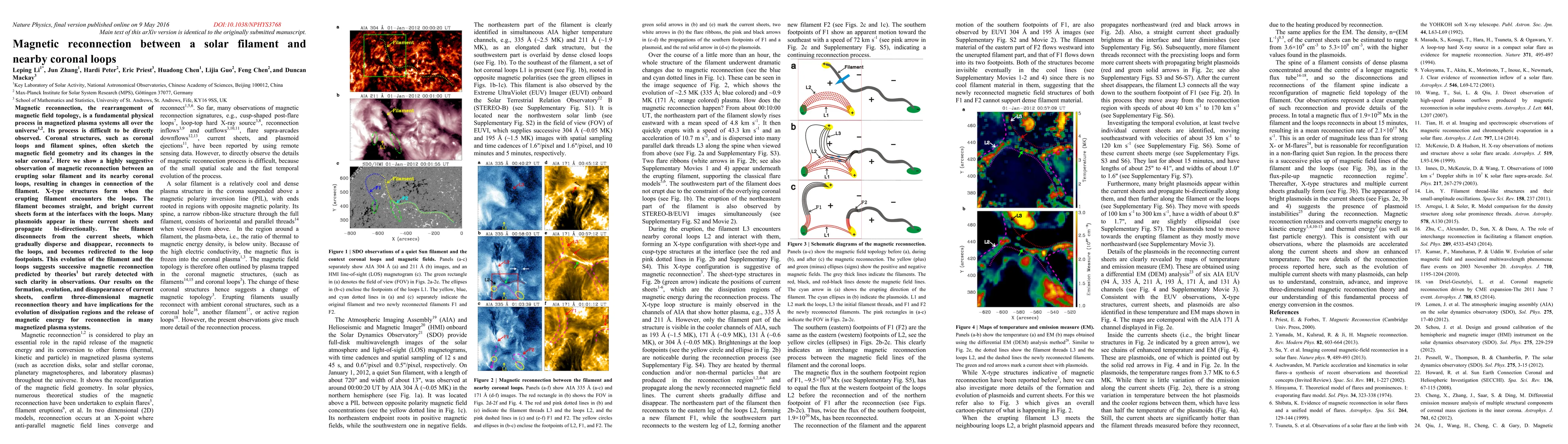 This study observes magnetic reconnection between a solar filament and nearby coronal loops, revealing the formation of X-type structures, current sheets, and plasmoids. The findings confirm three-dimensional reconnection theory and provide insights into the evolution of dissipation regions and magnetic energy release in magnetized plasma systems.