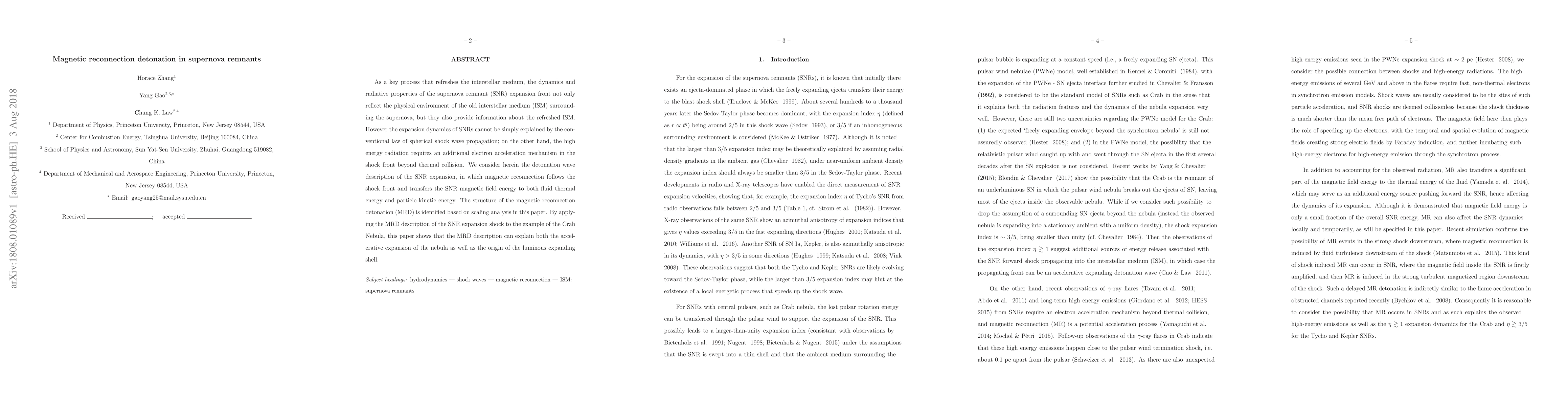This paper explores the dynamics of supernova remnant (SNR) expansion through the lens of magnetic reconnection detonation, proposing that magnetic reconnection following the shock front can explain the high-energy radiation and accelerated expansion observed in the Crab Nebula. The study identifies the structure of magnetic reconnection detonation based on scaling analysis and demonstrates its applicability to SNR phenomena.
