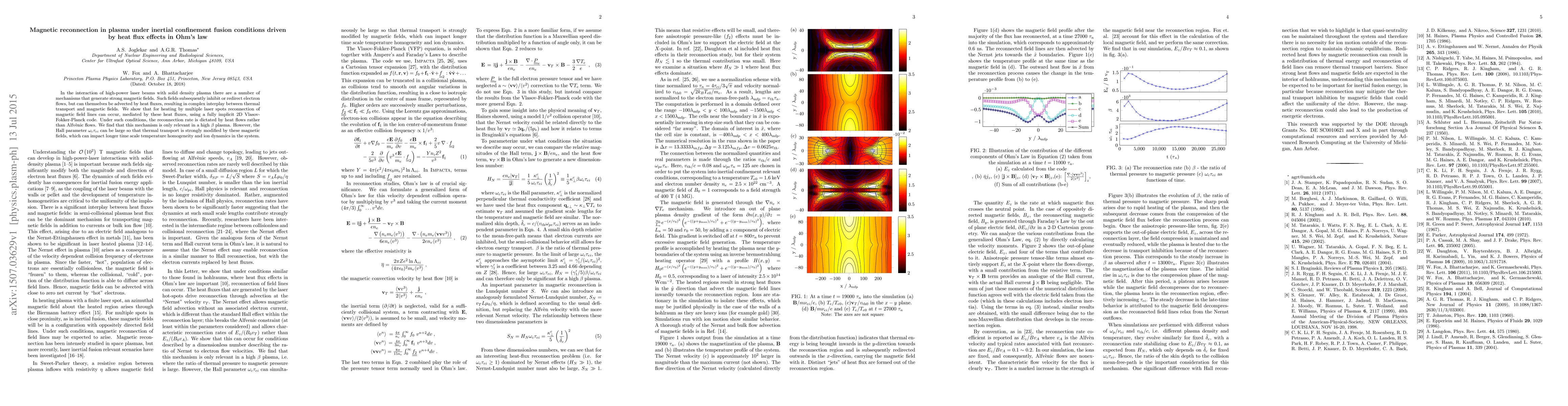 This paper investigates magnetic reconnection in plasma under inertial confinement fusion conditions, driven by heat flux effects in Ohm's law. It demonstrates that reconnection is mediated by heat fluxes from multiple laser spots, with the reconnection rate governed by heat flows rather than Alfv\`enic flows, particularly in high $\beta$ plasmas.