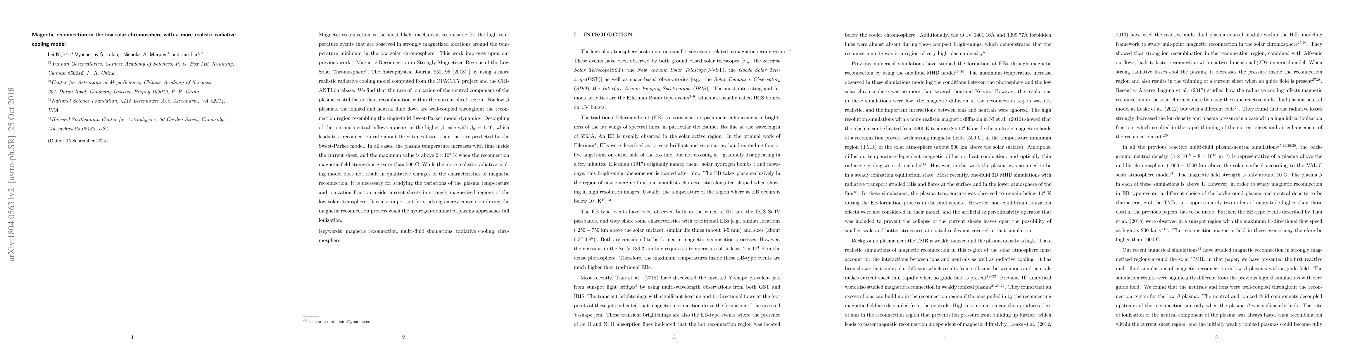 This study investigates magnetic reconnection in the low solar chromosphere using a more realistic radiative cooling model, finding that the rate of ionization exceeds recombination within the current sheet. The reconnection rate is significantly higher in high $\beta$ plasmas, exceeding the Sweet-Parker model predictions, while the plasma temperature rises above $2\times10^4$~K for strong magnetic fields.