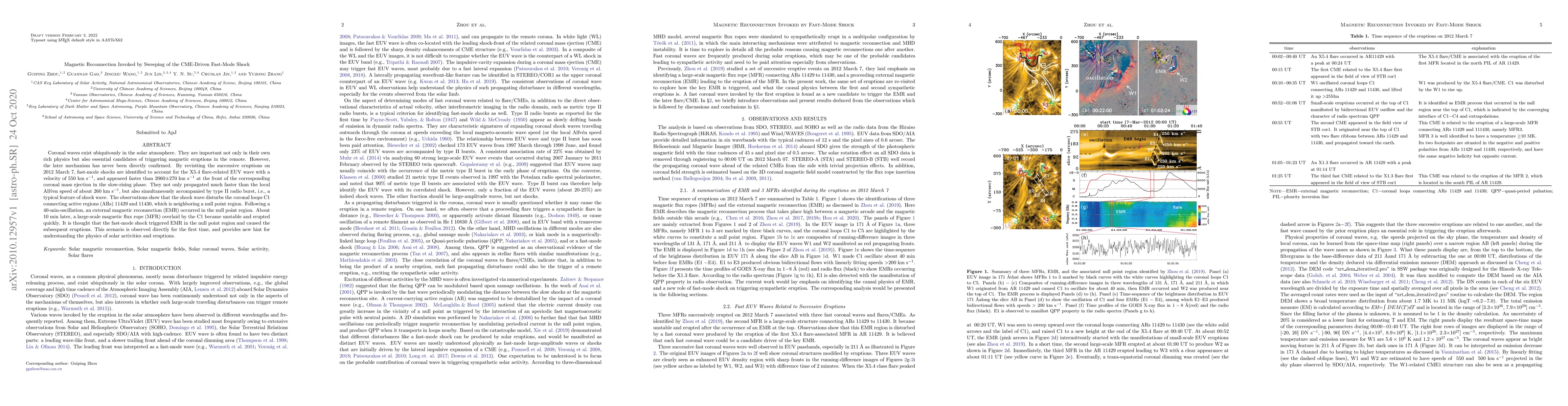 Coronal waves exist ubiquitously in the solar atmosphere. They are important not only in their own rich physics but also essential candidates of triggering magnetic eruptions in the remote. However, the later mechanism has never been directly confirmed. By revisiting the successive eruptions on 2012 March 7, fast-mode shocks are identified to account for the X5.4 flare-related EUV wave with a velocity of 550 km/s, and appeared faster than 2060$\pm$270 km/s at the front of the corresponding coronal mass ejection in the slow-rising phase. They not only propagated much faster than the local Alfven speed of about 260 km/s, but also simultaneously accompanied by type II radio burst, i.e., a typical feature of shock wave. The observations show that the shock wave disturbs the coronal loops C1 connecting active regions (ARs) 11429 and 11430, which is neighboring a null point region. Following a 40-min-oscillation, an external magnetic reconnection (EMR) occurred in the null point region. About 10 min later, a large-scale magnetic flux rope (MFR) overlaid by the C1 became unstable and erupted quickly. It is thought that the fast-mode shock triggered EMR in the null point region and caused the subsequent eruptions. This scenario is observed directly for the first time, and provides new hint for understanding the physics of solar activities and eruptions.