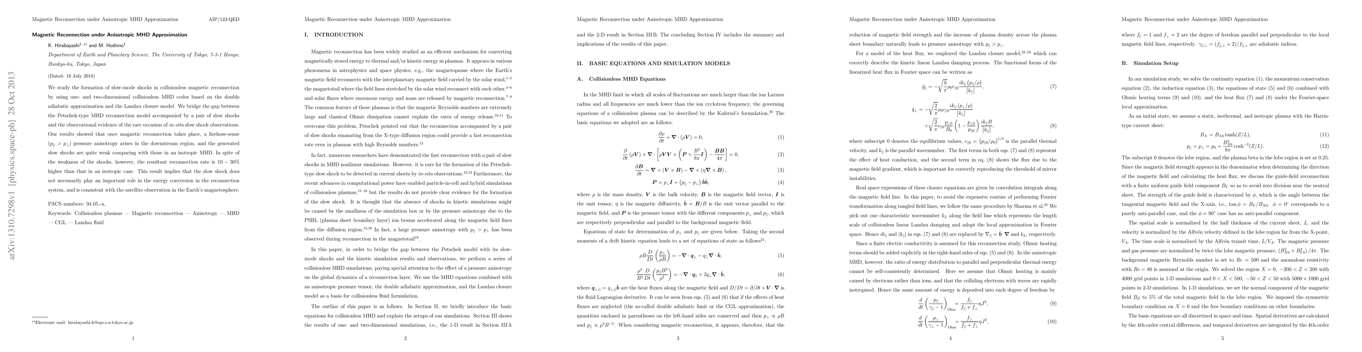 This study investigates slow-mode shocks in collisionless magnetic reconnection using advanced MHD models, revealing that despite the weak nature of these shocks, the reconnection rate is 10-30% higher than in isotropic conditions. The findings suggest that slow shocks may not be crucial for energy conversion in reconnection processes.