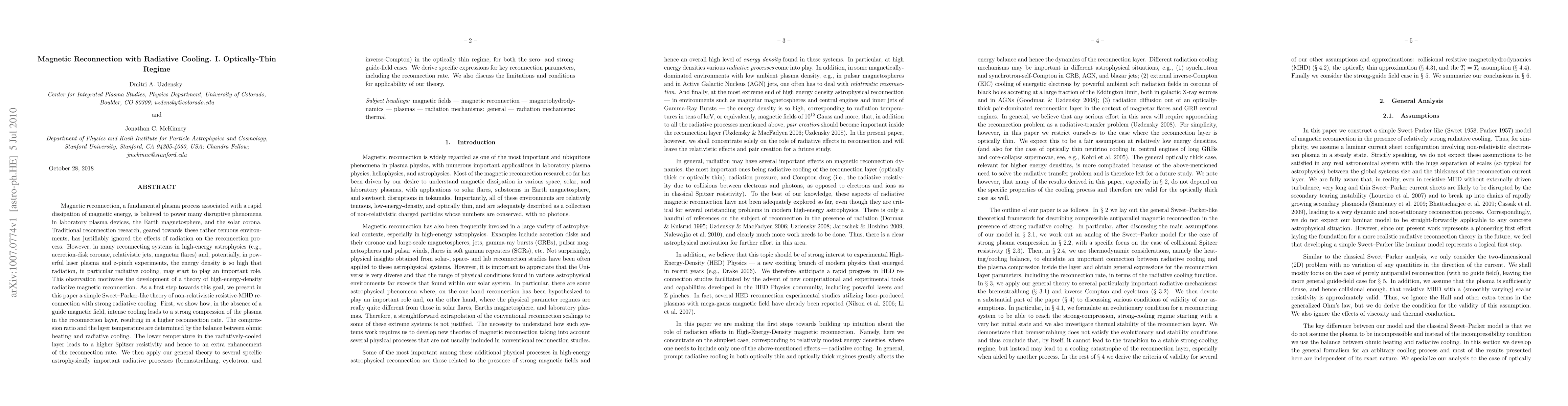 Magnetic reconnection, a fundamental plasma process associated with a rapid dissipation of magnetic energy, is believed to power many disruptive phenomena in laboratory plasma devices, the Earth magnetosphere, and the solar corona. Traditional reconnection research, geared towards these rather tenuous environments, has justifiably ignored the effects of radiation on the reconnection process. However, in many reconnecting systems in high-energy astrophysics (e.g., accretion-disk coronae, relativistic jets, magnetar flares) and, potentially, in powerful laser plasma and z-pinch experiments, the energy density is so high that radiation, in particular radiative cooling, may start to play an important role. This observation motivates the development of a theory of high-energy-density radiative magnetic reconnection. As a first step towards this goal, we present in this paper a simple Sweet--Parker-like theory of non-relativistic resistive-MHD reconnection with strong radiative cooling. First, we show how, in the absence of a guide magnetic field, intense cooling leads to a strong compression of the plasma in the reconnection layer, resulting in a higher reconnection rate. The compression ratio and the layer temperature are determined by the balance between ohmic heating and radiative cooling. The lower temperature in the radiatively-cooled layer leads to a higher Spitzer resistivity and hence to an extra enhancement of the reconnection rate. We then apply our general theory to several specific astrophysically important radiative processes (bremsstrahlung, cyclotron, and inverse-Compton) in the optically thin regime, for both the zero- and strong-guide-field cases. We derive specific expressions for key reconnection parameters, including the reconnection rate. We also discuss the limitations and conditions for applicability of our theory.