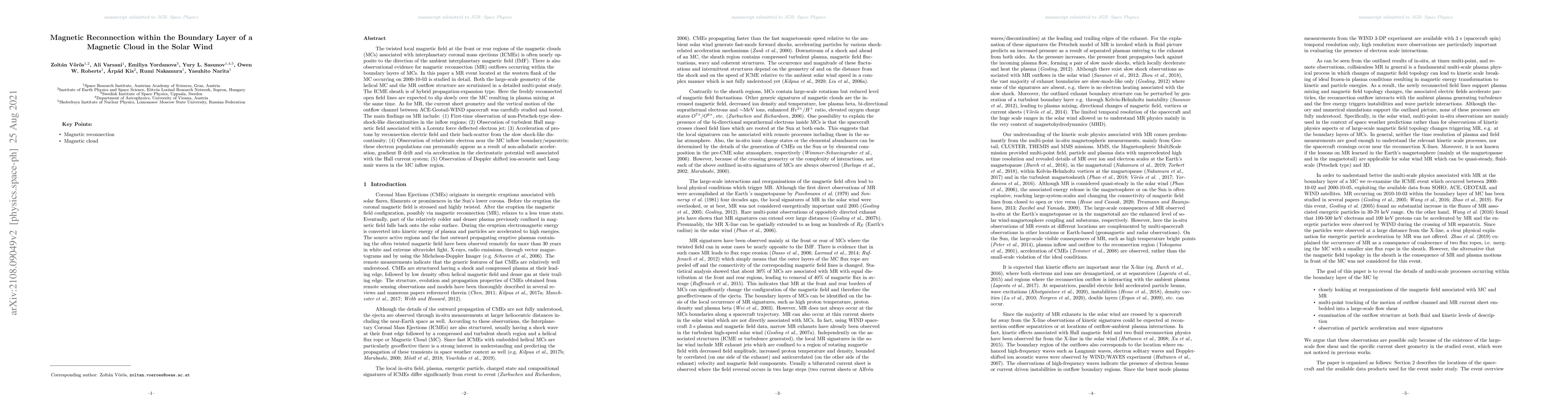 Researchers study magnetic reconnection within a solar wind magnetic cloud, observing new phenomena such as slow-shock-like discontinuities and relativistic electron populations.
