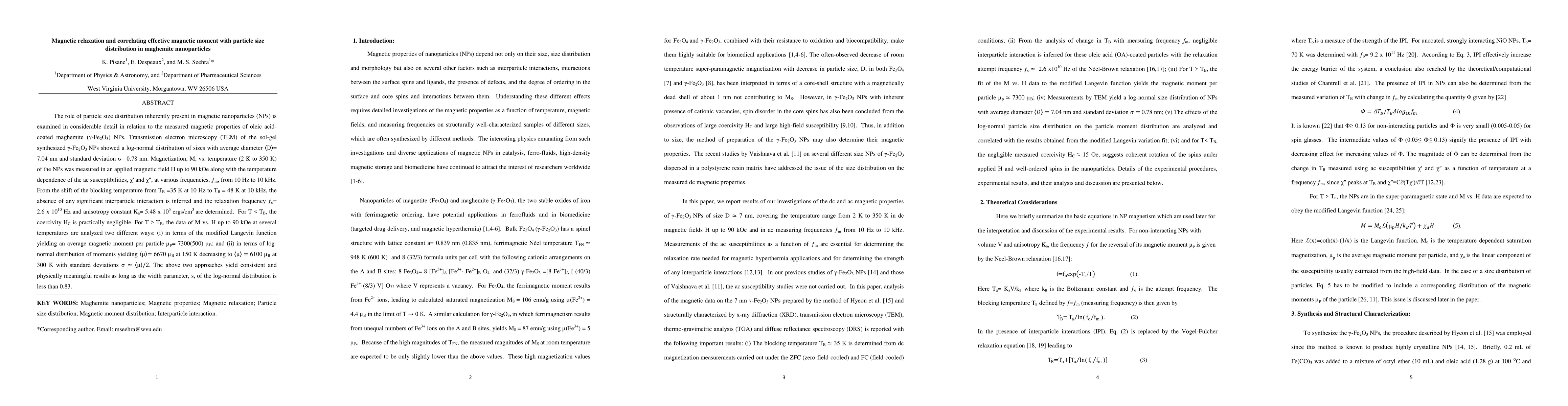This study investigates the magnetic relaxation and effective magnetic moment of oleic acid-coated maghemite nanoparticles, revealing a log-normal size distribution and negligible interparticle interaction. The analysis shows consistent results for magnetic moment calculations using both modified Langevin and log-normal distribution models.