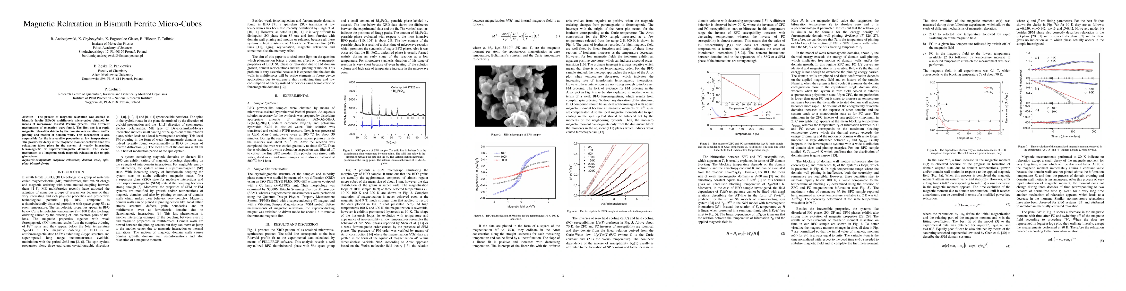 This study investigates magnetic relaxation in bismuth ferrite BiFeO3 micro-cubes, identifying two relaxation mechanisms: rapid relaxation via domain reorientation and long-term relaxation due to spin glass-phase. The rapid mechanism involves domain wall motion and is responsible for irreversible properties at low temperatures.