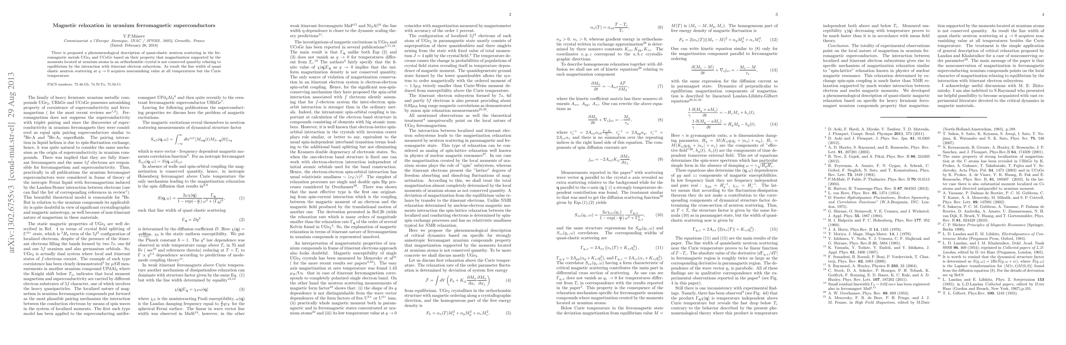 This paper proposes a phenomenological theory explaining quasi-elastic neutron scattering in uranium-based ferromagnetic superconductors, UGe$_2$ and UCoGe, where magnetization relaxation occurs due to interactions with itinerant electrons, resulting in a non-zero scattering line width at all temperatures except the Curie temperature.