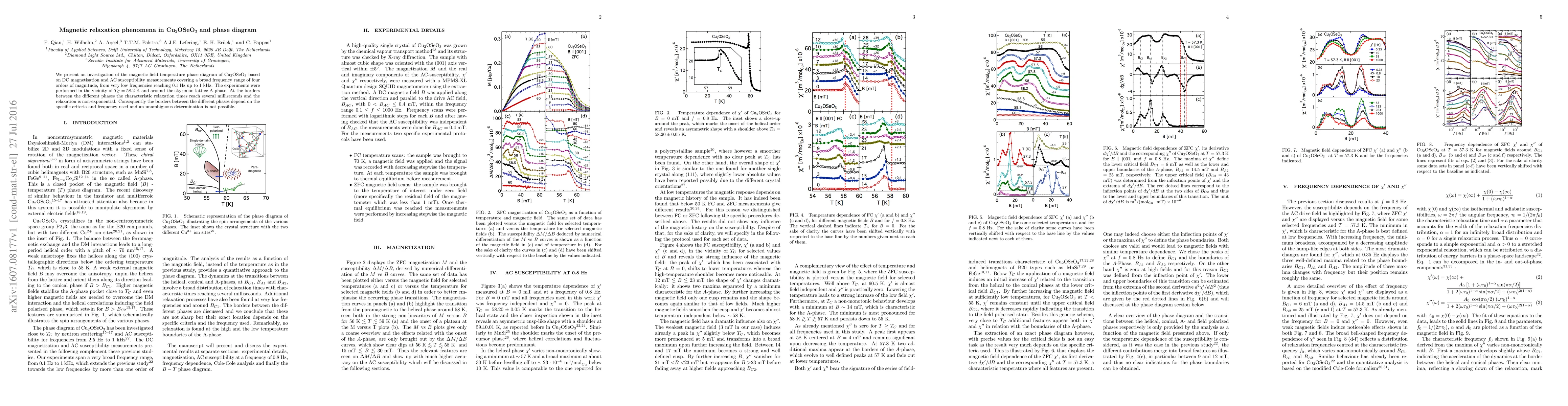 The research examines Cu$_2$OSeO$_3$'s magnetic field-temperature phase diagram using DC magnetization and AC susceptibility measurements across a wide frequency range. It reveals non-exponential relaxation at phase boundaries, making precise phase determination frequency-dependent and ambiguous.