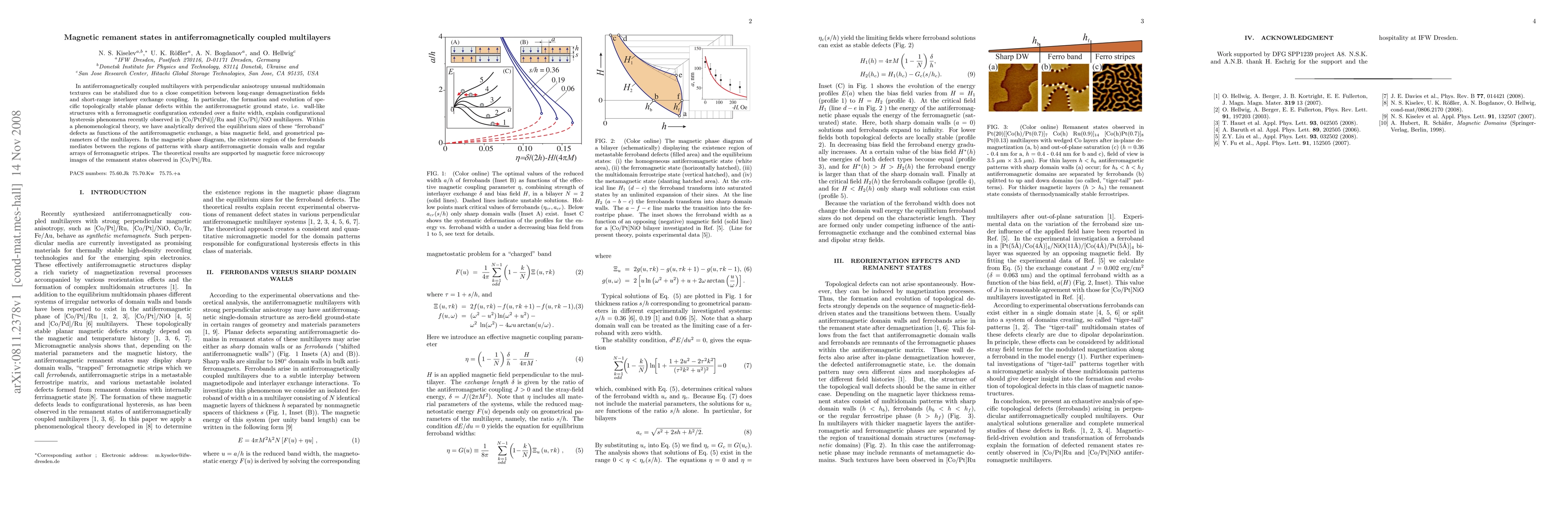 This paper investigates the magnetic remanent states in antiferromagnetically coupled multilayers, revealing the stabilization of unusual multidomain textures due to competition between demagnetization fields and interlayer exchange coupling. The study identifies "ferroband" defects as topologically stable planar structures explaining observed hysteresis, and provides a theoretical framework to determine their equilibrium sizes.