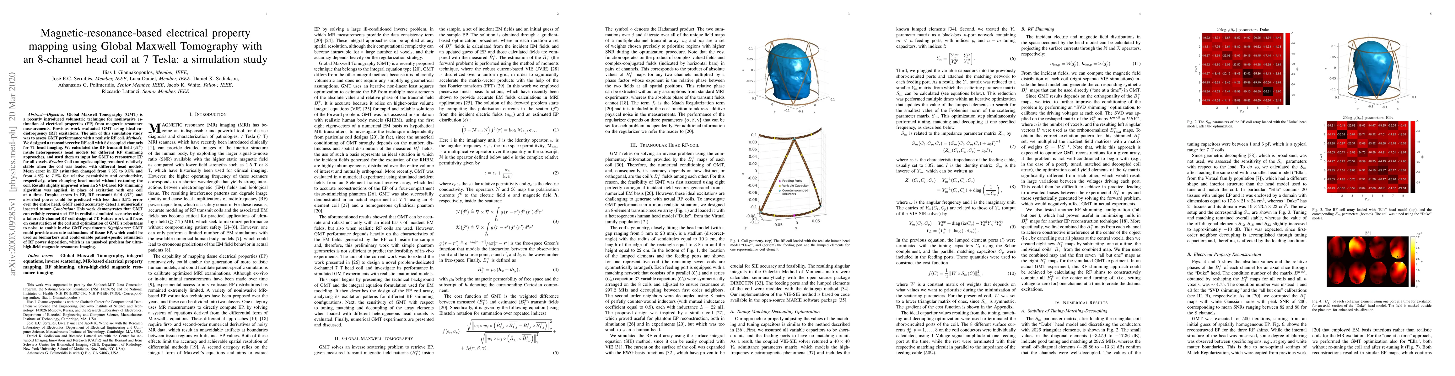 Objective: Global Maxwell Tomography (GMT) is a recently introduced volumetric technique for noninvasive estimation of electrical properties (EP) from magnetic resonance measurements. Previous work evaluated GMT using ideal radiofrequency (RF) excitations. The aim of this simulation study was to assess GMT performance with a realistic RF coil. Methods: We designed a transmit-receive RF coil with $8$ decoupled channels for $7$T head imaging. We calculated the RF transmit field ($B_1^+$) inside heterogeneous head models for different RF shimming approaches, and used them as input for GMT to reconstruct EP for all voxels. Results: Coil tuning/decoupling remained relatively stable when the coil was loaded with different head models. Mean error in EP estimation changed from $7.5\%$ to $9.5\%$ and from $4.8\%$ to $7.2\%$ for relative permittivity and conductivity, respectively, when changing head model without re-tuning the coil. Results slightly improved when an SVD-based RF shimming algorithm was applied, in place of excitation with one coil at a time. Despite errors in EP, RF transmit field ($B_1^+$) and absorbed power could be predicted with less than $0.5\%$ error over the entire head. GMT could accurately detect a numerically inserted tumor. Conclusion: This work demonstrates that GMT can reliably reconstruct EP in realistic simulated scenarios using a tailored 8-channel RF coil design at $7$T. Future work will focus on construction of the coil and optimization of GMT's robustness to noise, to enable in-vivo GMT experiments. Significance: GMT could provide accurate estimations of tissue EP, which could be used as biomarkers and could enable patient-specific estimation of RF power deposition, which is an unsolved problem for ultra-high-field magnetic resonance imaging.