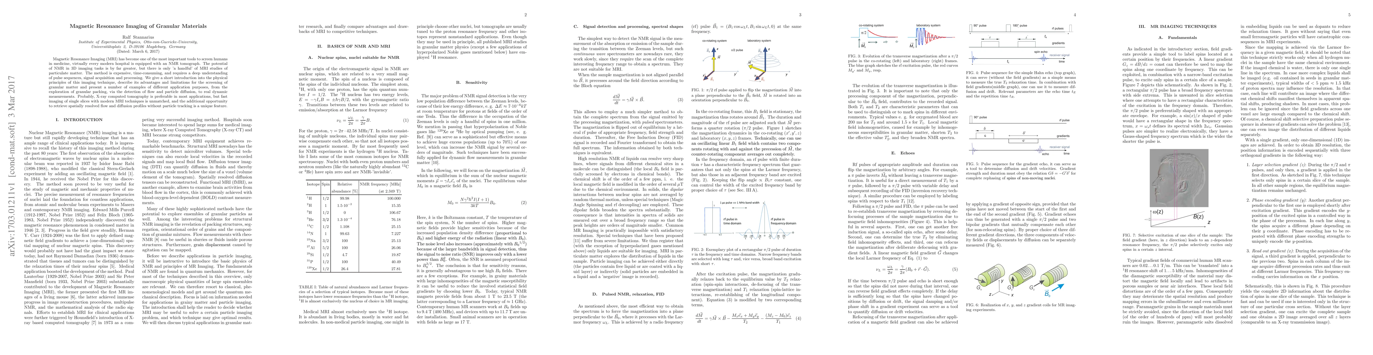 Magnetic Resonance Imaging (MRI) has become one of the most important tools to screen humans in medicine, virtually every modern hospital is equipped with an NMR tomograph. The potential of NMR in 3D imaging tasks is by far greater, but there is only 'a handful' of MRI studies of particulate matter. The method is expensive, time-consuming, and requires a deep understanding of pulse sequences, signal acquisition and processing. We give a short introduction into the physical principles of this imaging technique, describe its advantages and limitations for the screening of granular matter and present a number of examples of different application purposes, from the exploration of granular packing, via the detection of flow and particle diffusion, to real dynamic measurements. Probably, X-ray computed tomography is preferable in most applications, but fast imaging of single slices with modern MRI techniques is unmatched, and the additional opportunity to retrieve spatially resolved flow and diffusion profiles without particle tracking is a unique feature.