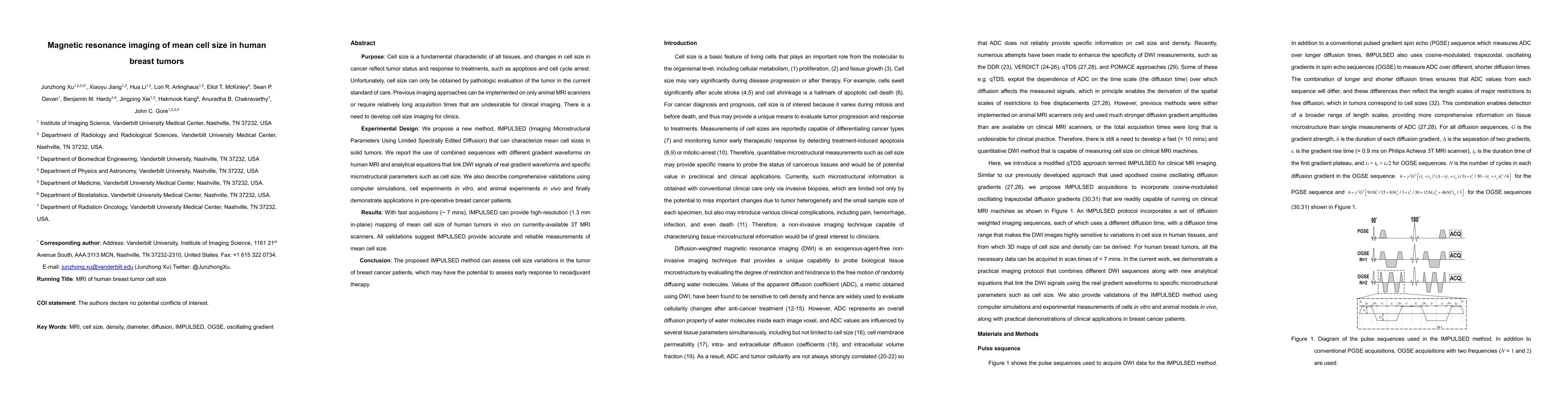 This paper proposes a new MRI method called IMPULSED to accurately measure mean cell size in human breast tumors, which could help assess tumor status and treatment response. The method provides high-resolution, fast acquisition imaging and has been validated through simulations, in vitro, and in vivo experiments, showing potential for clinical use in breast cancer patients.