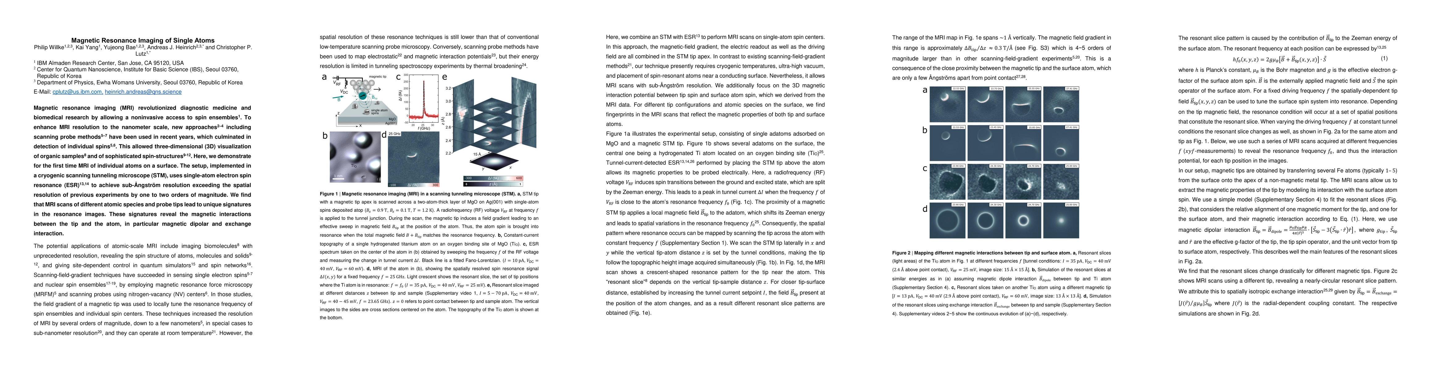 This paper demonstrates the first MRI of individual atoms on a surface using a cryogenic scanning tunneling microscope, achieving sub-Ångström resolution via single-atom electron spin resonance. The unique signatures in the resonance images reveal magnetic interactions between the probe tip and the atom, including magnetic dipolar and exchange interactions.