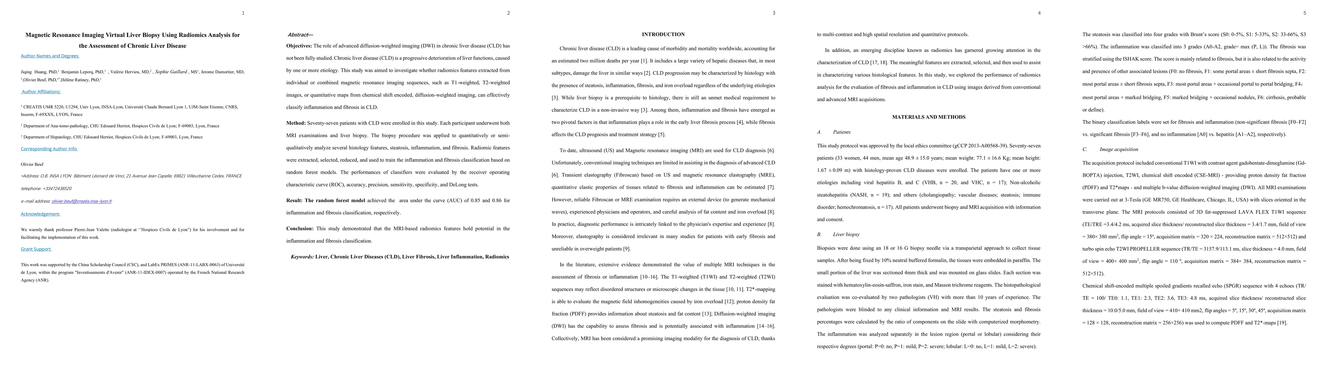 Objectives: The role of advanced diffusion-weighted imaging (DWI) in chronic liver disease (CLD) has not been fully studied. Chronic liver disease (CLD) is a progressive deterioration of liver functions, caused by one or more etiology. This study was aimed to investigate whether radiomics features extracted from individual or combined magnetic resonance imaging sequences, such as T1-weighted, T2-weighted images, or quantitative maps from chemical shift encoded, diffusion-weighted imaging, can effectively classify inflammation and fibrosis in CLD. Method: Seventy-seven patients with CLD were enrolled in this study. Each participant underwent both MRI examinations and liver biopsy. The biopsy procedure was applied to quantitatively or semi-qualitatively analyze several histology features, steatosis, inflammation, and fibrosis. Radiomic features were extracted, selected, reduced, and used to train the inflammation and fibrosis classification based on random forest models. The performances of classifiers were evaluated by the receiver operating characteristic curve (ROC), accuracy, precision, sensitivity, specificity, and DeLong tests. Result: The random forest model achieved the area under the curve (AUC) of 0.85 and 0.86 for inflammation and fibrosis classification, respectively. Conclusion: This study demonstrated that the MRI-based radiomics features hold potential in the inflammation and fibrosis classification.