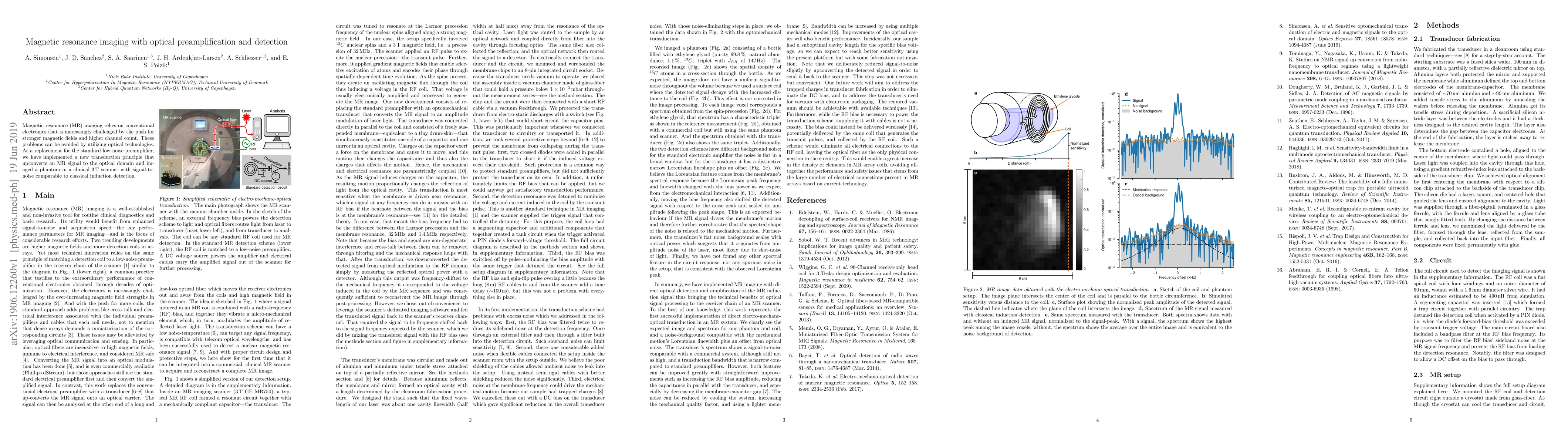 Magnetic resonance (MR) imaging relies on conventional electronics that is increasingly challenged by the push for stronger magnetic fields and higher channel count. These problems can be avoided by utilizing optical technologies. As a replacement for the standard low-noise preamplifier, we have implemented a new transduction principle that upconverts an MR signal to the optical domain and imaged a phantom in a clinical 3 T scanner with signal-to-noise comparable to classical induction detection.