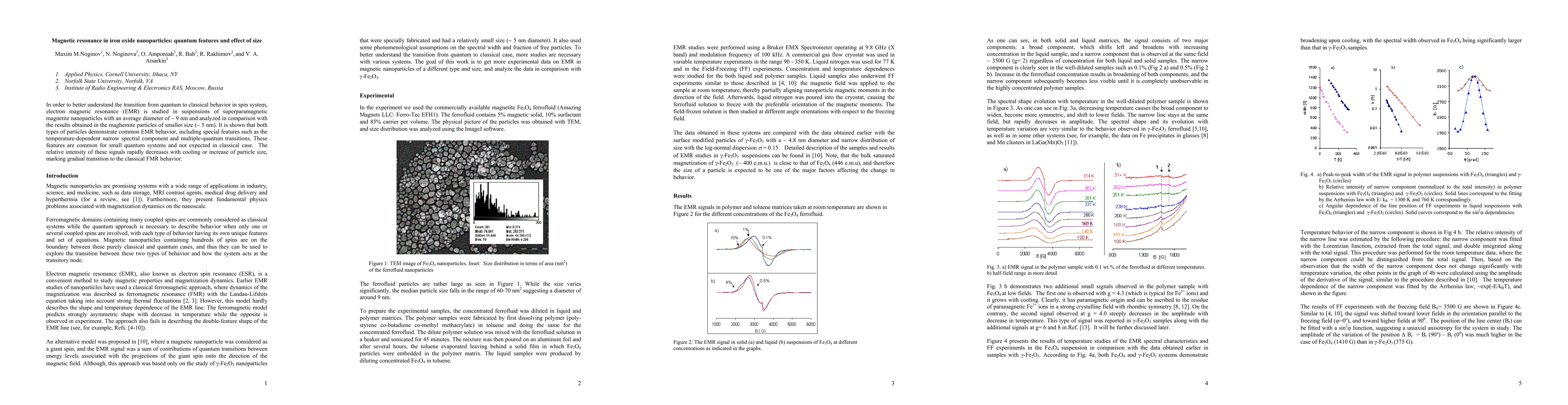 In order to better understand the transition from quantum to classical behavior in spin system, electron magnetic resonance (EMR) is studied in suspensions of superparamagnetic magnetite nanoparticles with an average diameter of ~ 9 nm and analyzed in comparison with the results obtained in the maghemite particles of smaller size (~ 5 nm). It is shown that both types of particles demonstrate common EMR behavior, including special features such as the temperature-dependent narrow spectral component and multiple-quantum transitions. These features are common for small quantum systems and not expected in classical case. The relative intensity of these signals rapidly decreases with cooling or increase of particle size, marking gradual transition to the classical FMR behavior.