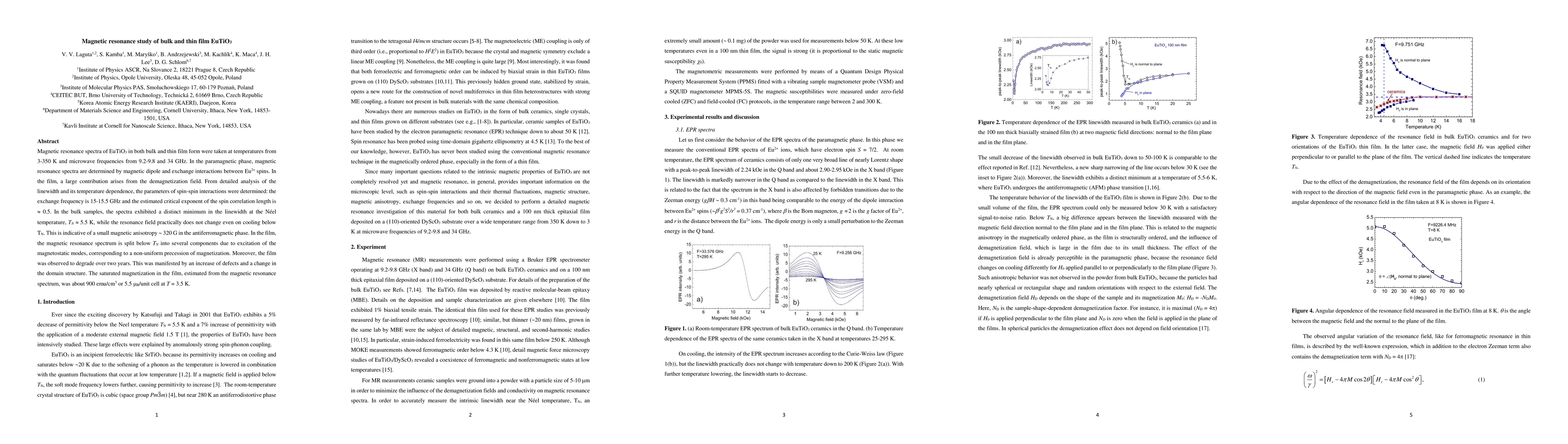 This study investigates the magnetic resonance spectra of EuTiO3 in bulk and thin film forms, revealing distinct magnetic behaviors. In the paramagnetic phase, interactions between Eu2+ spins are influenced by magnetic dipole and exchange interactions, with a notable contribution from the demagnetization field in the film. The analysis indicates a small magnetic anisotropy and a critical exponent of ~0.5, with the thin film exhibiting magnetostatic mode excitations and degradation over time.