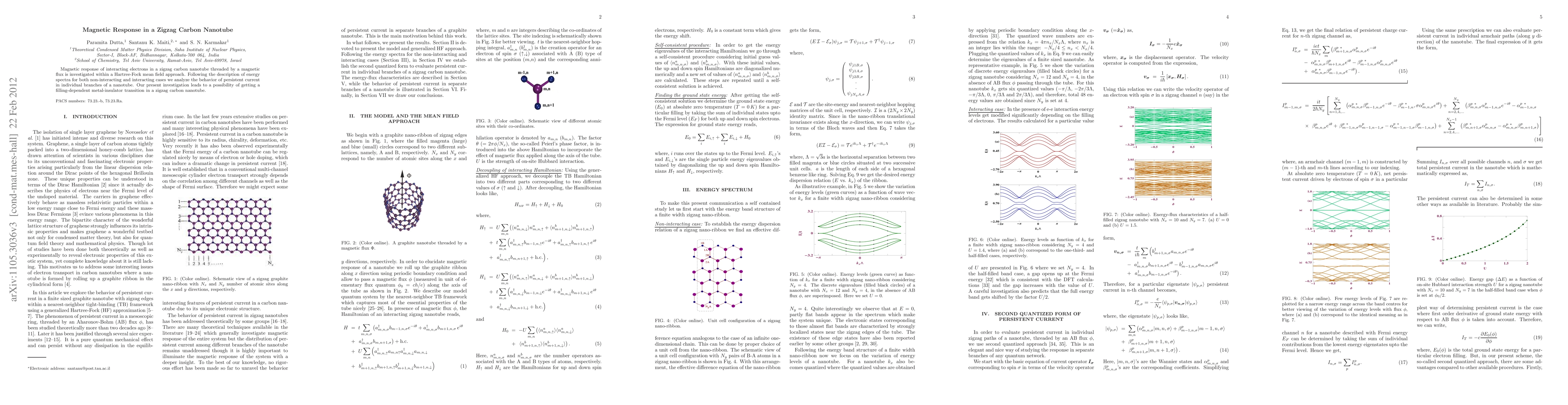 This paper investigates the magnetic response of electrons in a zigzag carbon nanotube under a magnetic flux using a Hartree-Fock approach, and finds a potential filling-dependent metal-insulator transition in these nanotubes. The study also analyzes the persistent current behavior in the nanotube's branches.