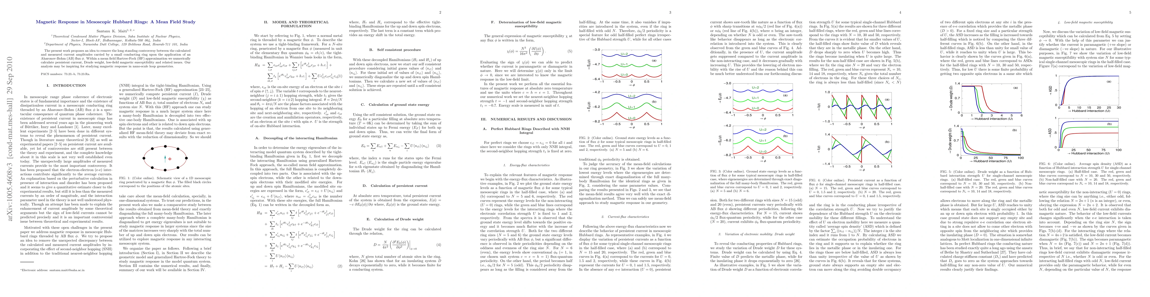 The present work proposes an idea to remove the long standing controversy between the calculated and measured current amplitudes carried by a small conducting ring upon the application of an Aharonov-Bohm (AB) flux $\phi$. Within a mean field Hartree-Fock (HF) approximation we numerically calculate persistent current, Drude weight, low-field magnetic susceptibility and related issues. Our analysis may be inspiring for studying magnetic response in nano-scale loop geometries.