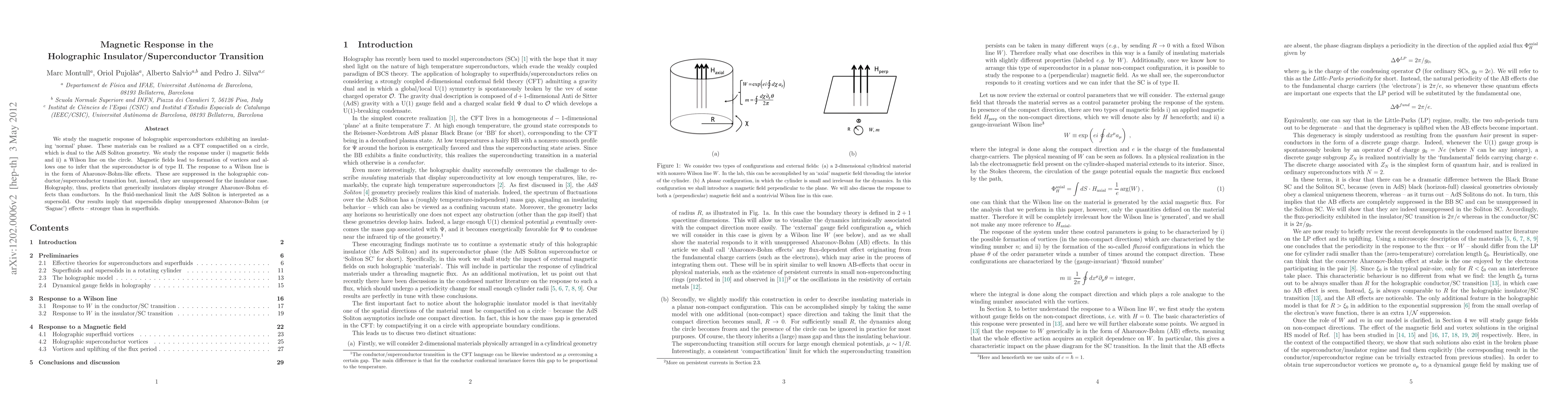 We study the magnetic response of holographic superconductors exhibiting an insulating "normal" phase. These materials can be realized as a CFT compactified on a circle, which is dual to the AdS Soliton geometry. We study the response under i) magnetic fields and ii) a Wilson line on the circle. Magnetic fields lead to formation of vortices and allows one to infer that the superconductor is of type II. The response to a Wilson line is in the form of Aharonov-Bohm-like effects. These are suppressed in the holographic conductor/superconductor transition but, instead, they are unsuppressed for the insulator case. Holography, thus, predicts that generically insulators display stronger Aharonov-Bohm effects than conductors. In the fluid-mechanical limit the AdS Soliton is interpreted as a supersolid. Our results imply that supersolids display unsuppressed Aharonov-Bohm (or "Sagnac") effects - stronger than in superfluids.