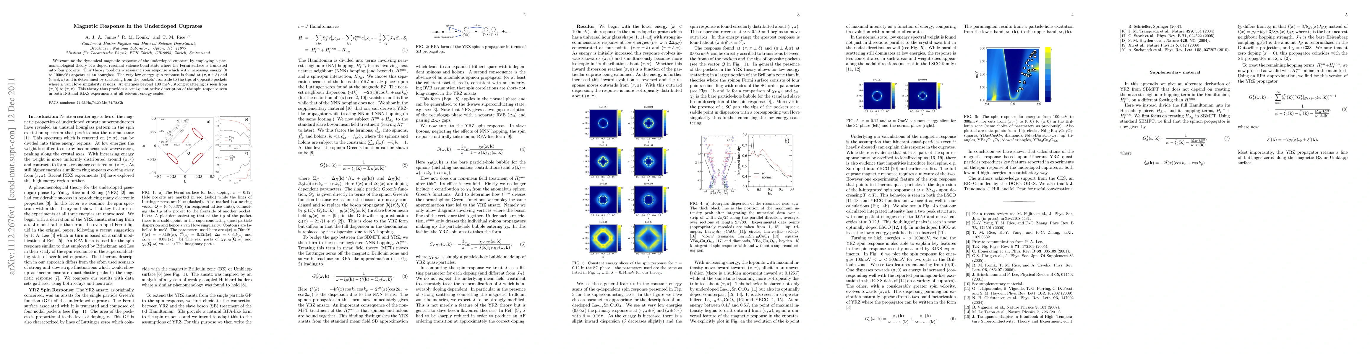 This paper explores the magnetic response in underdoped cuprates using a phenomenological theory of a doped resonant valence bond state, predicting an hourglass-shaped spin response in dynamical measurements. The low-energy spin response is linked to scattering between Fermi surface pockets, while higher energies show strong scattering across the Brillouin zone.