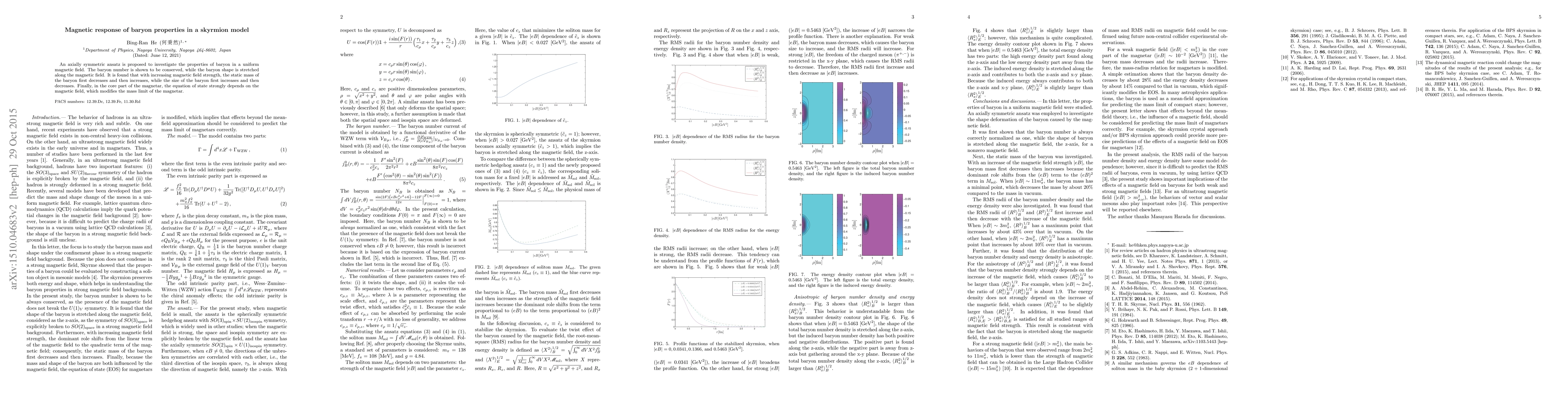 An axially symmetric ansatz is proposed to investigate the properties of baryon in a uniform magnetic field. The baryon number is shown to be conserved, while the baryon shape is stretched along the magnetic field. It is found that with increasing magnetic field strength, the static mass of the baryon first decreases and then increases, while the size of the baryon first increases and then decreases. Finally, in the core part of the magnetar, the equation of state strongly depends on the magnetic field, which modifies the mass limit of the magnetar.