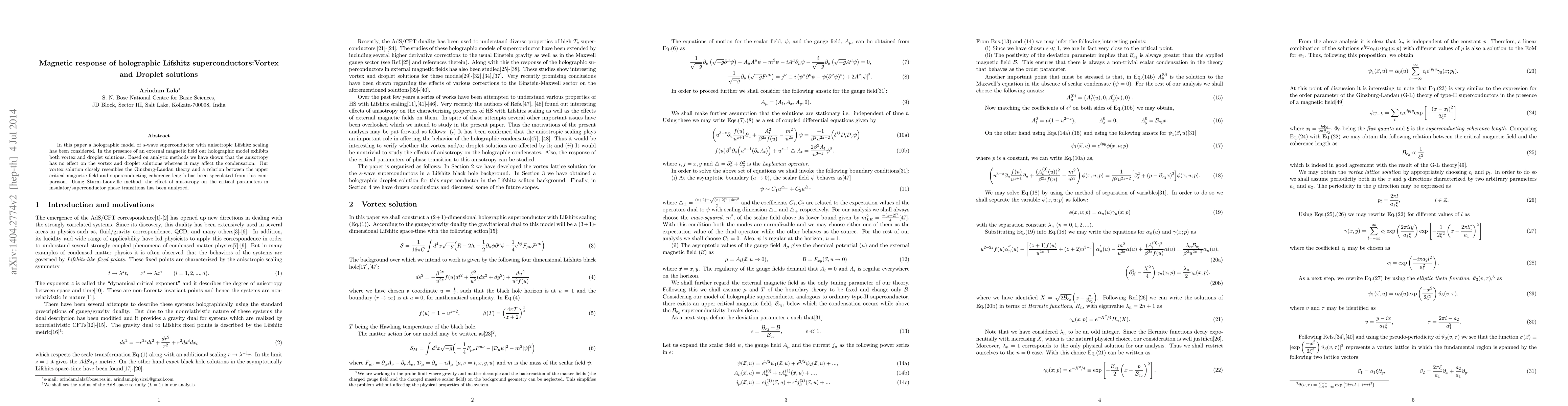 This paper explores a holographic model of anisotropic Lifshitz superconductors under an external magnetic field, revealing vortex and droplet solutions. The study shows that while anisotropy does not affect vortex and droplet solutions, it may influence condensation, and a relation between the upper critical magnetic field and superconducting coherence length is proposed.