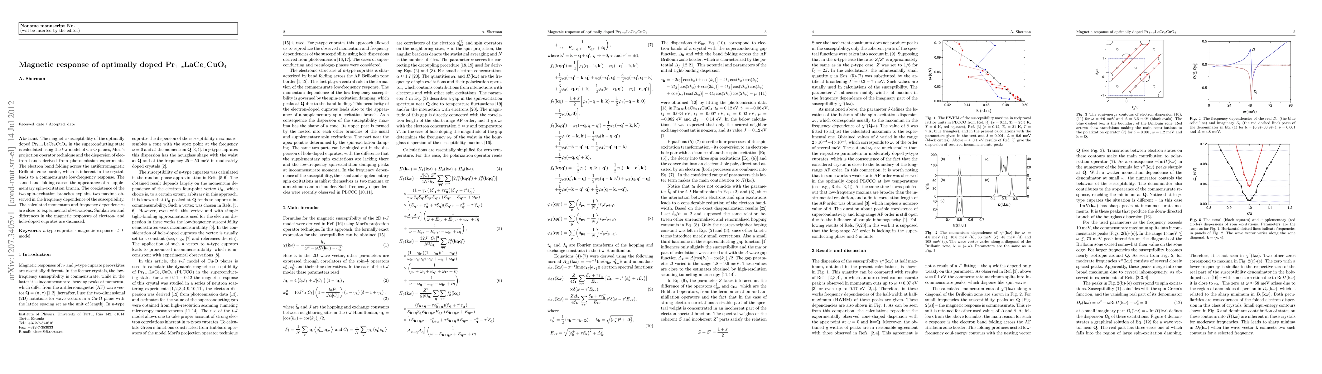 This research calculates the magnetic susceptibility of optimally doped Pr$_{1-x}$LaCe$_x$CuO$_4$ using the t-J model and Mori's technique, attributing the observed low-frequency commensurate response and two susceptibility maxima to electron band folding across the antiferromagnetic zone border. The study also contrasts magnetic responses of electron- and hole-doped cuprates.