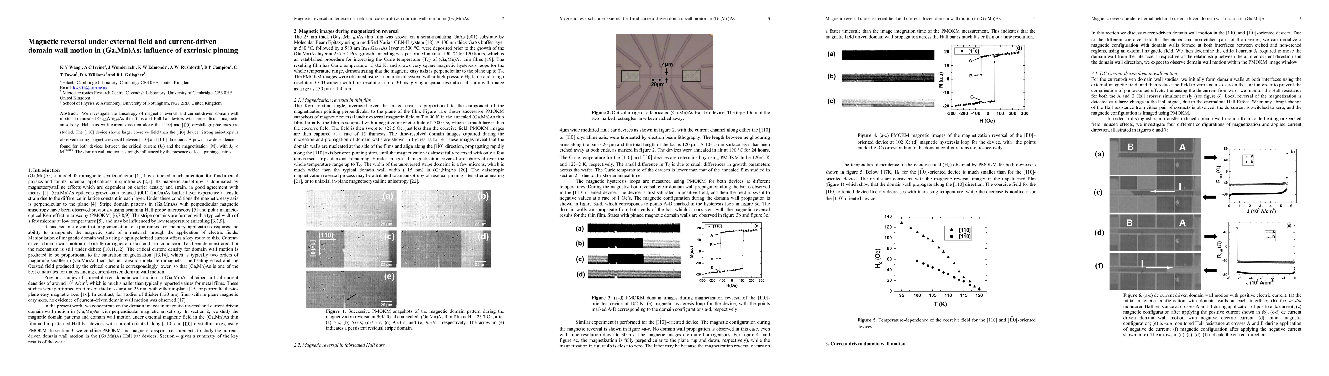 Summary: This study examines magnetic reversal anisotropy and current-driven domain wall motion in (Ga,Mn)As thin films, revealing a strong directional dependence and significant influence of extrinsic pinning centers on domain wall motion. The findings show a power law relationship between critical current and magnetization, highlighting the impact of crystallographic direction on coercive fields.