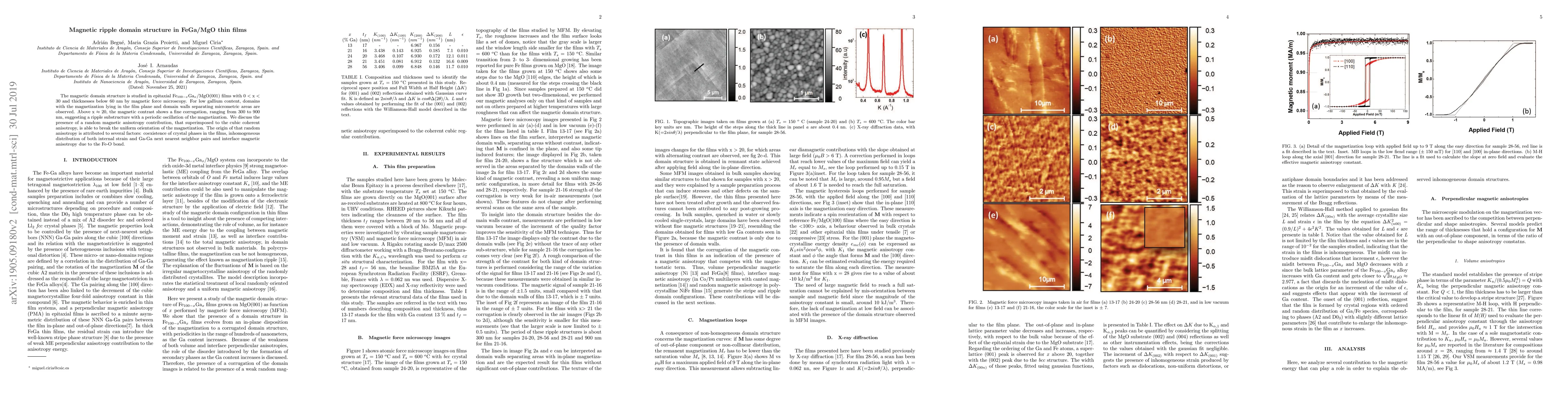 The magnetic domain structure is studied in epitaxial Fe$_{100-x}$Ga$_x$/MgO(001) films with 0 $<$ x $<$ 30 and thicknesses below 60 nm by magnetic force microscopy. For low gallium content, domains with the magnetization lying in the film plane and domain walls separating micrometric areas are observed. Above x $\approx$ 20, the magnetic contrast shows a fine corrugation, ranging from 300 to 900 nm, suggesting a ripple substructure with a periodic oscillation of the magnetization. We discuss the presence of a random magnetic anisotropy contribution, that superimposed to the cubic coherent anisotropy, is able to break the uniform orientation of the magnetization. The origin of that random anisotropy is attributed to several factors: coexistence of crystal phases in the films, inhomogeneous distribution of both internal strain and Ga-Ga next nearest neighbor pairs and interface magnetic anisotropy due to the Fe-O bond.