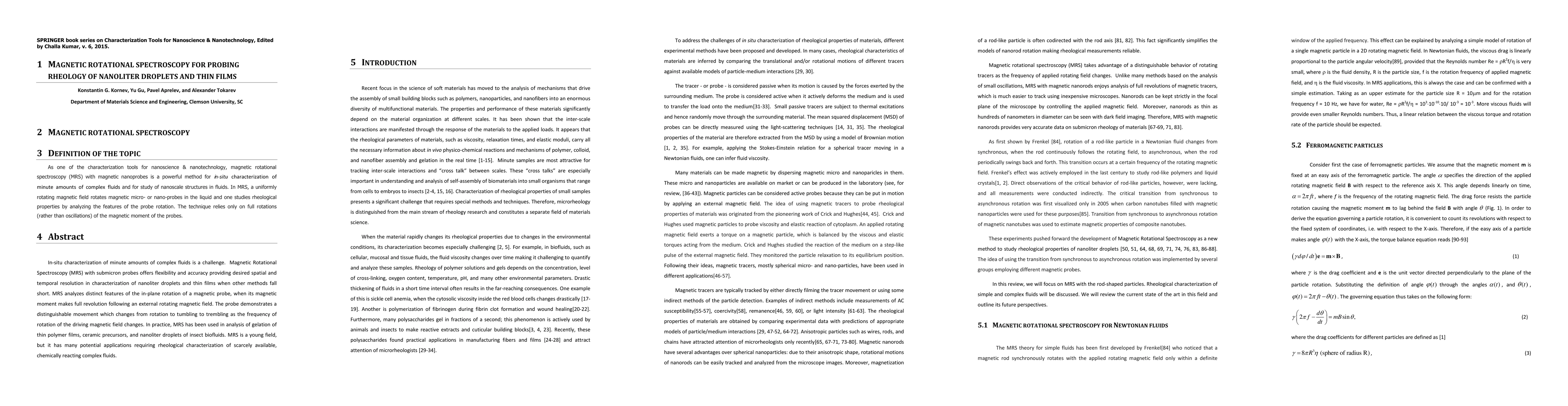 In-situ characterization of minute amounts of complex fluids is a challenge. Magnetic Rotational Spectroscopy (MRS) with submicron probes offers flexibility and accuracy providing desired spatial and temporal resolution in characterization of nanoliter droplets and thin films when other methods fall short. MRS analyzes distinct features of the in-plane rotation of a magnetic probe, when its magnetic moment makes full revolution following an external rotating magnetic field. The probe demonstrates a distinguishable movement which changes from rotation to tumbling to trembling as the frequency of rotation of the driving magnetic field changes. In practice, MRS has been used in analysis of gelation of thin polymer films, ceramic precursors, and nanoliter droplets of insect biofluids. MRS is a young field, but it has many potential applications requiring rheological characterization of scarcely available, chemically reacting complex fluids.