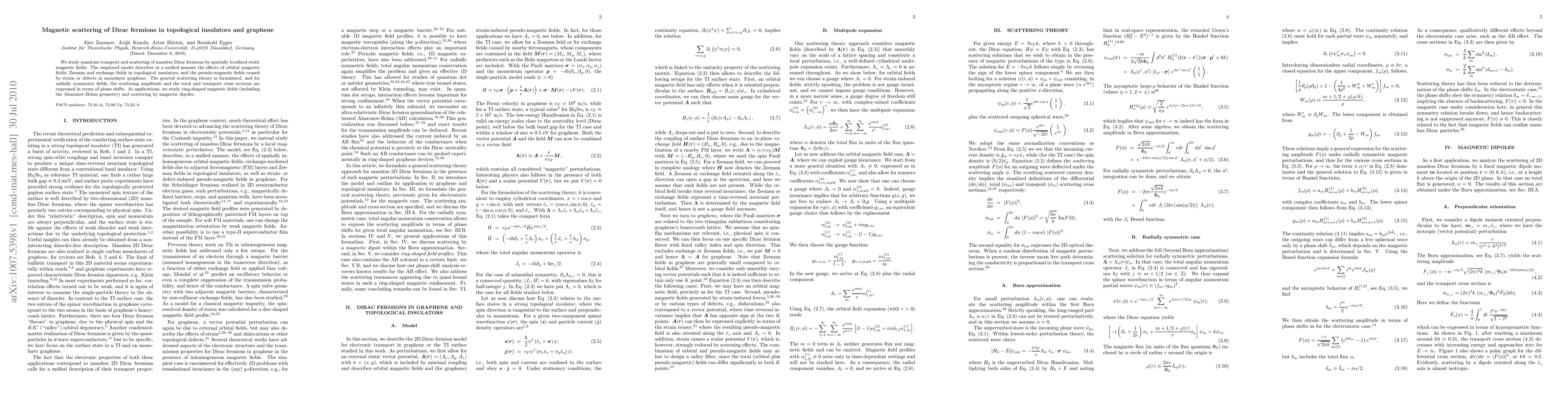 This paper investigates quantum transport and scattering of Dirac fermions in topological insulators and graphene under spatially localized magnetic fields. The study formulates a unified scattering theory, providing expressions for scattering amplitudes and cross sections, and applies these to ring-shaped magnetic fields and magnetic dipoles.