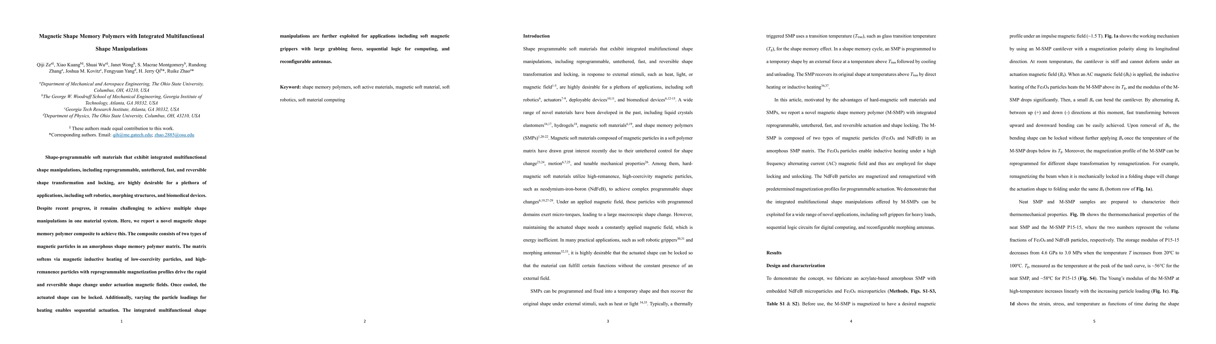 This paper introduces a novel magnetic shape memory polymer composite with integrated multifunctional shape manipulations, enabling reprogrammable, untethered, and reversible shape transformations. The composite leverages magnetic particles for actuation and shape locking, with applications in soft robotics, morphing structures, and biomedical devices.