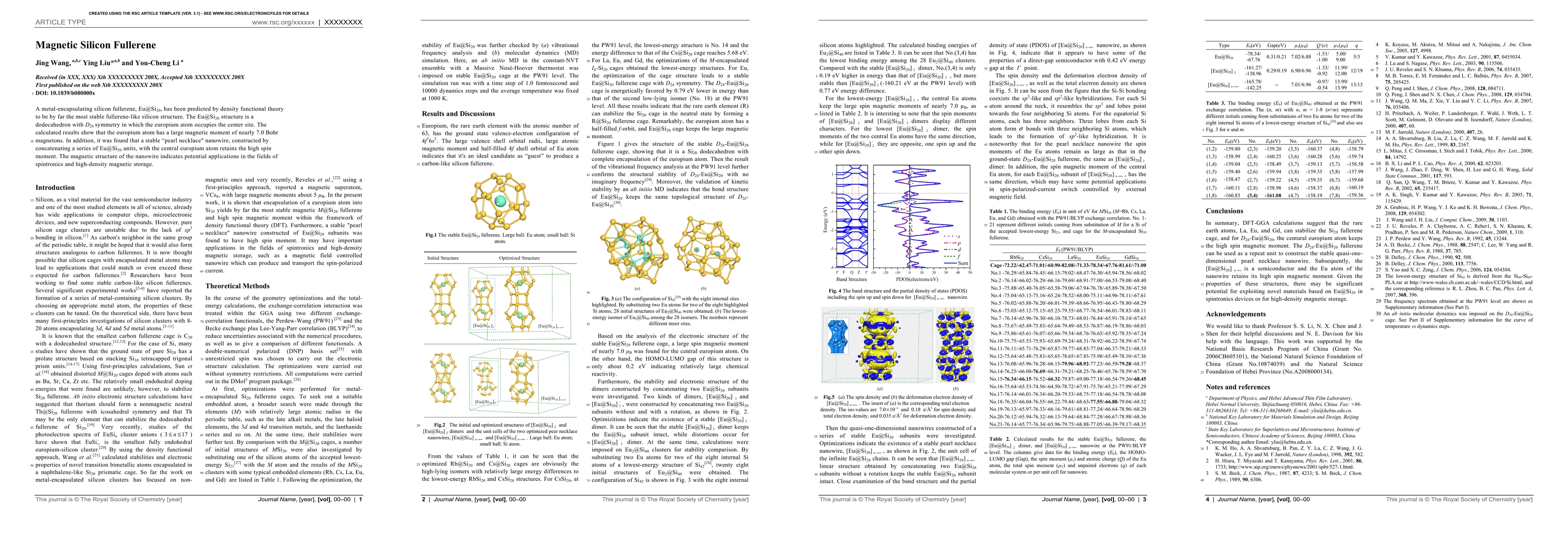 A metal-encapsulating silicon fullerene, Eu@Si20, has been predicted by density functional theory to be by far the most stable fullerene-like silicon structure. The Eu@Si20 structure is a dodecahedron with D2h symmetry in which the europium atom occupies the center site. The calculated results show that the europium atom has a large magnetic moment of nearly 7.0 Bohr magnetons. In addition, it was found that a stable "pearl necklace" nanowire, constructed by concatenating a series of Eu@Si20 units, with the central europium atom, retains the high spin moment. The magnetic structure of the nanowire indicates potential applications in the fields of spintronics and high-density magnetic storage.