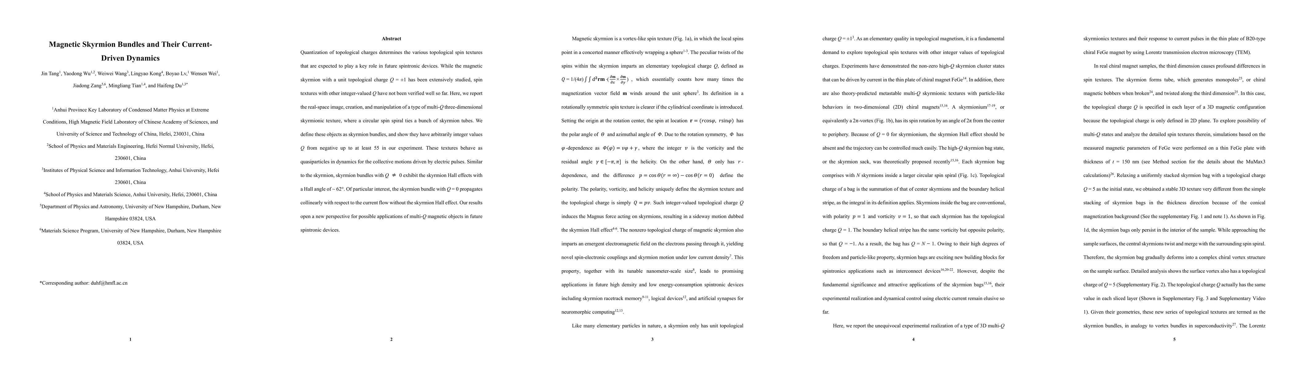 This paper reports the creation and manipulation of magnetic skyrmion bundles, multi-topological charge spin textures that can have integer values of Q from negative to at least 55. These skyrmion bundles exhibit collective motion dynamics driven by electric currents, similar to skyrmions, and can be used in future spintronic devices.