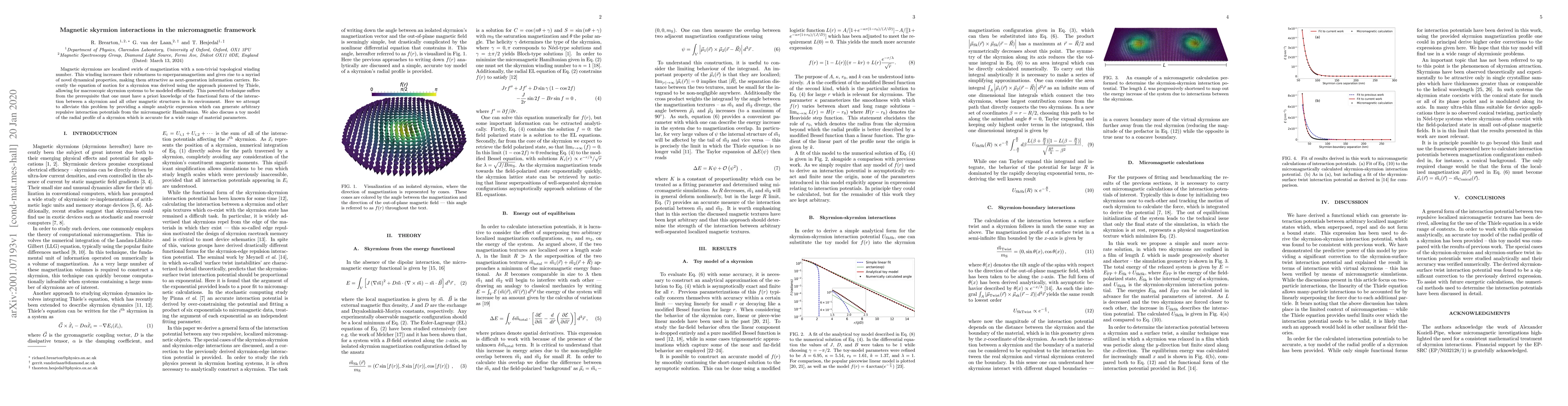 Magnetic skyrmions are localized swirls of magnetization with a non-trivial topological winding number. This winding increases their robustness to superparamagnetism and gives rise to a myriad of novel dynamical properties, making them attractive as next-generation information carriers. Recently the equation of motion for a skyrmion was derived using the approach pioneered by Thiele, allowing for macroscopic skyrmion systems to be modeled efficiently. This powerful technique suffers from the prerequisite that one must have a priori knowledge of the functional form of the interaction between a skyrmion and all other magnetic structures in its environment. Here we attempt to alleviate this problem by providing a simple analytic expression which can generate arbitrary repulsive interaction potentials from the micromagnetic Hamiltonian. We also discuss a toy model of the radial profile of a skyrmion which is accurate for a wide range of material parameters.