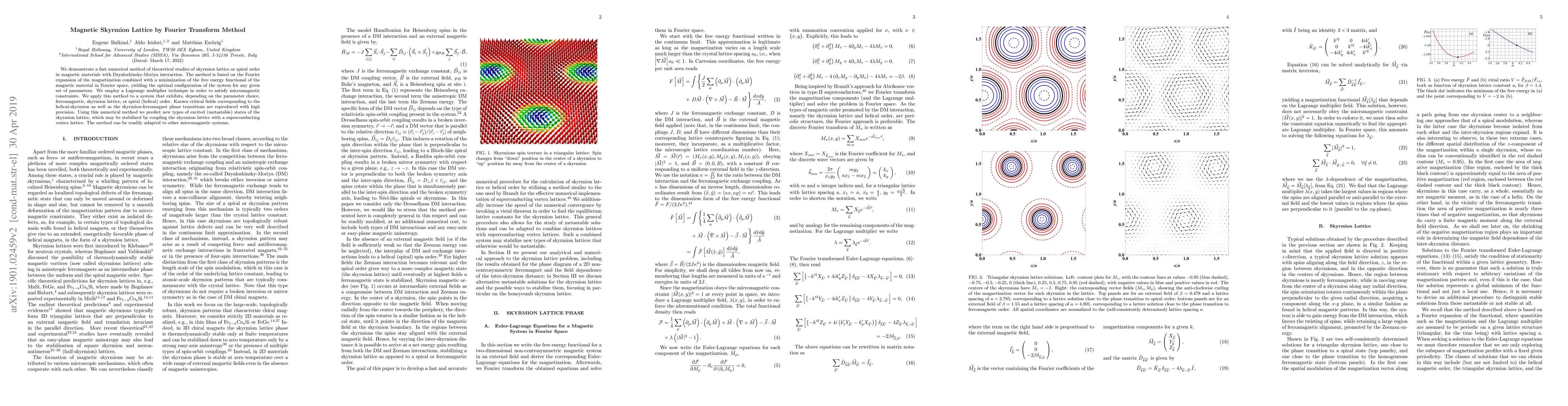 We demonstrate a fast numerical method of theoretical studies of skyrmion lattice or spiral order in magnetic materials with Dzyaloshinsky-Moriya interaction. The method is based on the Fourier expansion of the magnetization combined with a minimization of the free energy functional of the magnetic material in Fourier space, yielding the optimal configuration of the system for any given set of parameters. We employ a Lagrange multiplier technique in order to satisfy micromagnetic constraints. We apply this method to a system that exhibits, depending on the parameter choice, ferromagnetic, skyrmion lattice, or spiral (helical) order. Known critical fields corresponding to the helical-skyrmion as well as the skyrmion-ferromagnet phase transitions are reproduced with high precision. Using this numerical method we predict new types of excited (metastable) states of the skyrmion lattice, which may be stabilized by coupling the skyrmion lattice with a superconducting vortex lattice. The method can be readily adapted to other micromagnetic systems.
