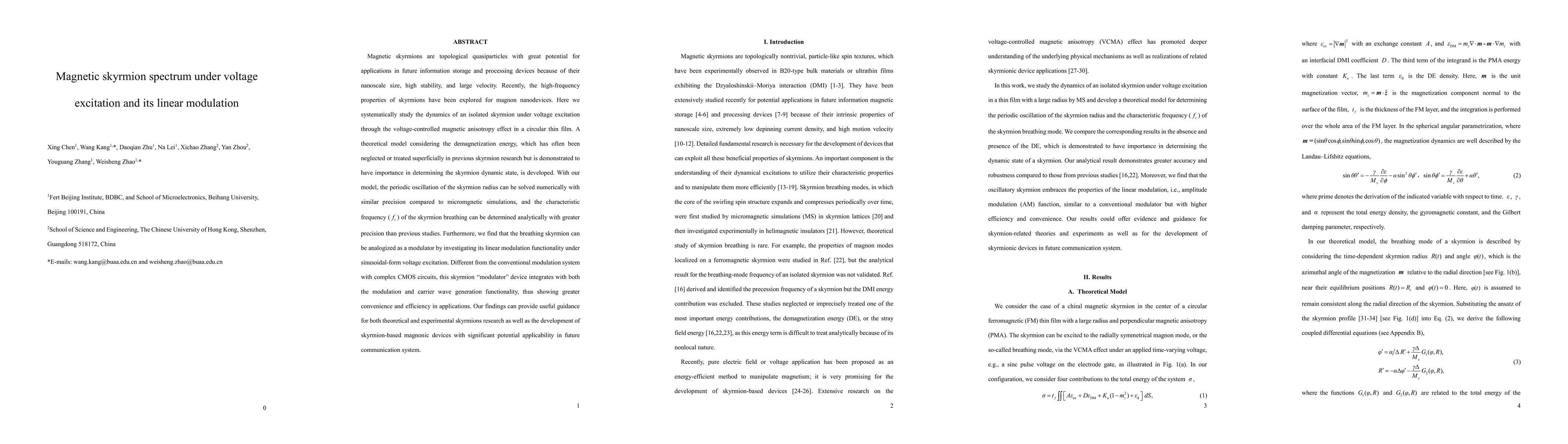 This paper develops a theoretical model to study the dynamics of magnetic skyrmions under voltage excitation, demonstrating the importance of demagnetization energy in determining skyrmion behavior. It reveals the skyrmion's linear modulation capability under voltage modulation, presenting a simpler, more efficient modulator for future communication systems.