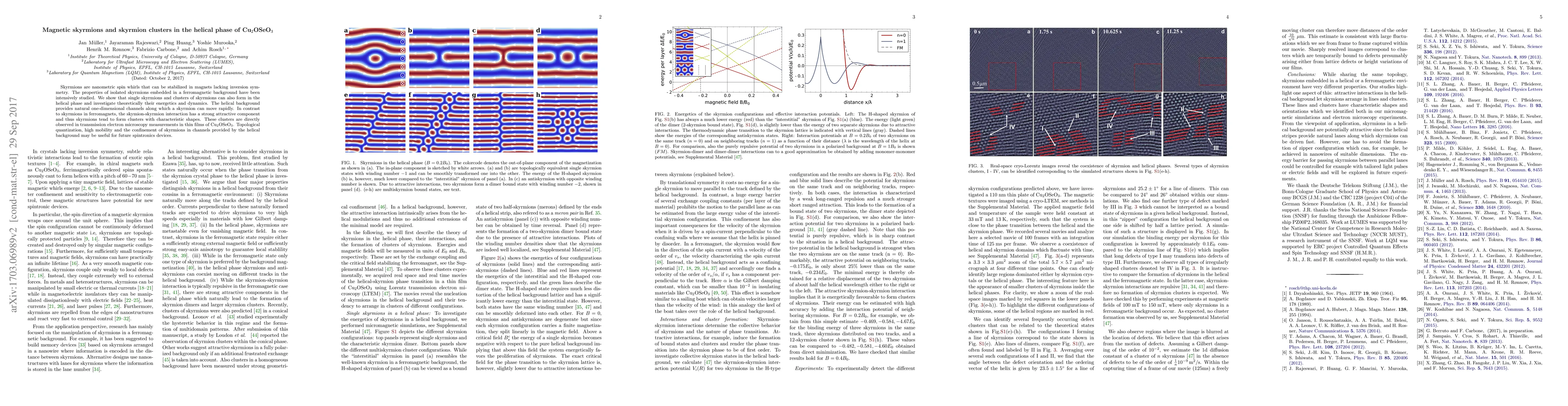 Skyrmions are nanometric spin whirls that can be stabilized in magnets lacking inversion symmetry. The properties of isolated skyrmions embedded in a ferromagnetic background have been intensively studied. We show that single skyrmions and clusters of skyrmions can also form in the helical phase and investigate theoretically their energetics and dynamics. The helical background provides natural one-dimensional channels along which a skyrmion can move rapidly. In contrast to skyrmions in ferromagnets, the skymion-skyrmion interaction has a strong attractive component and thus skyrmions tend to form clusters with characteristic shapes. These clusters are directly observed in transmission electron microscopy measurements in thin films of Cu$_2$OSeO$_3$. Topological quantization, high mobility and the confinement of skyrmions in channels provided by the helical background may be useful for future spintronics devices.