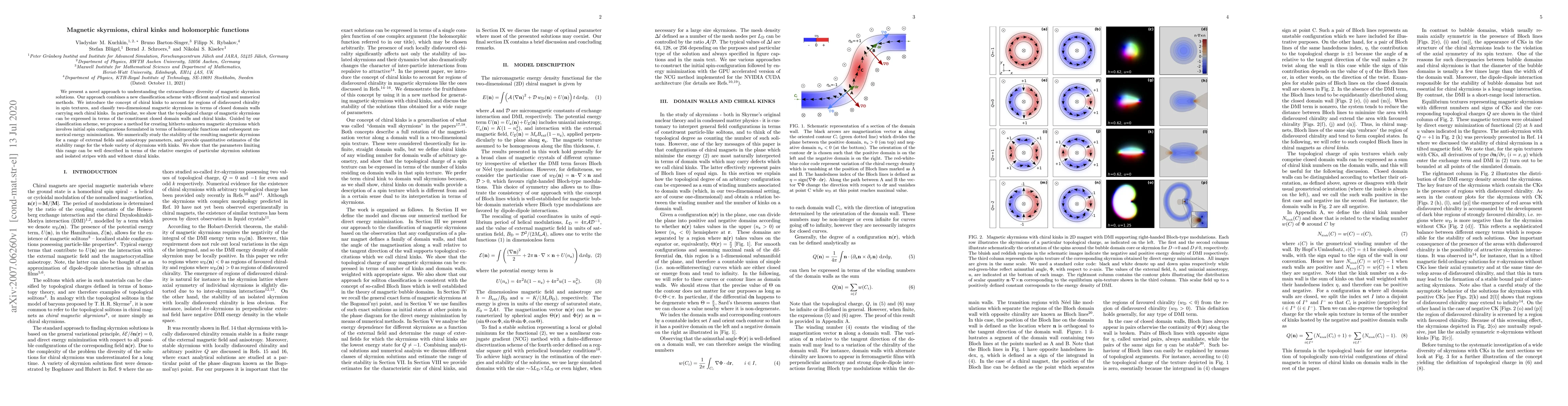 This paper introduces a new classification scheme for magnetic skyrmions, using chiral kinks and holomorphic functions to generate and analyze diverse spin textures. It proposes a method to create novel skyrmions through initial spin configurations and numerical optimization, and evaluates their stability under various conditions.