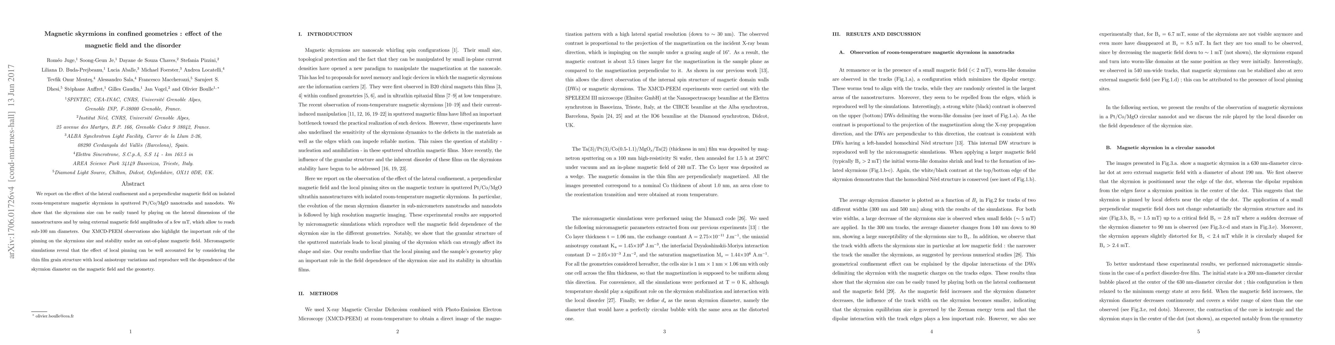 We report on the effect of the lateral confinement and a perpendicular magnetic field on isolated room-temperature magnetic skyrmions in sputtered Pt/Co/MgO nanotracks and nanodots. We show that the skyrmions size can be easily tuned by playing on the lateral dimensions of the nanostructures and by using external magnetic field amplitudes of a few mT, which allow to reach sub-100 nm diameters. Our XMCD-PEEM observations also highlight the important role of the pinning on the skyrmions size and stability under an out-of-plane magnetic field. Micromagnetic simulations reveal that the effect of local pinning can be well accounted for by considering the thin film grain structure with local anisotropy variations and reproduce well the dependence of the skyrmion diameter on the magnetic field and the geometry.