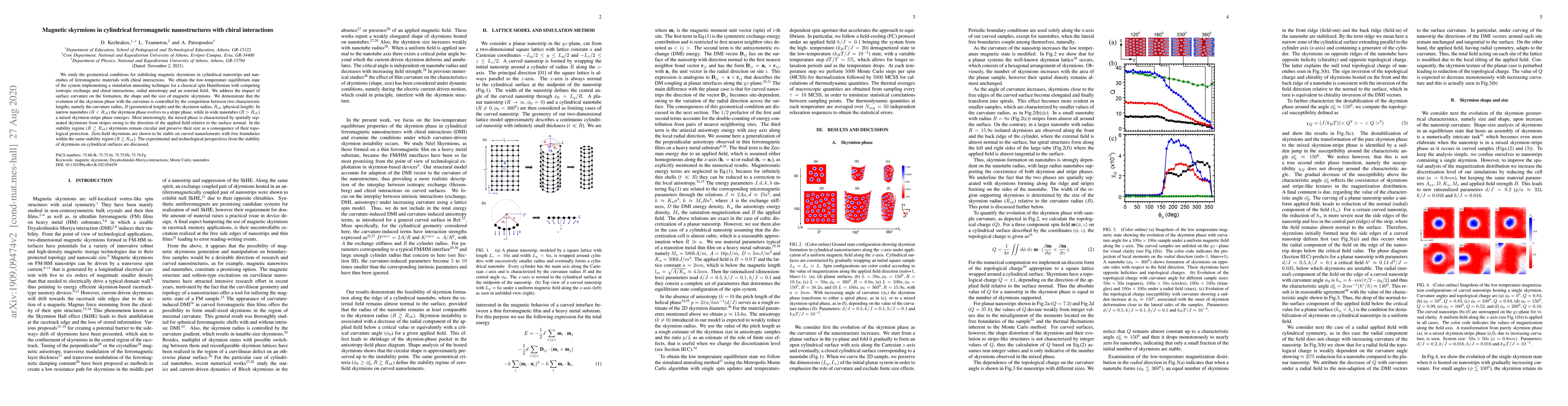 Researchers studied magnetic skyrmions in cylindrical ferromagnetic nanostructures with chiral interactions, finding that their formation and stability depend on the nanostripe or nanotube's curvature, leading to distinct phase behaviors in narrow versus wide structures.