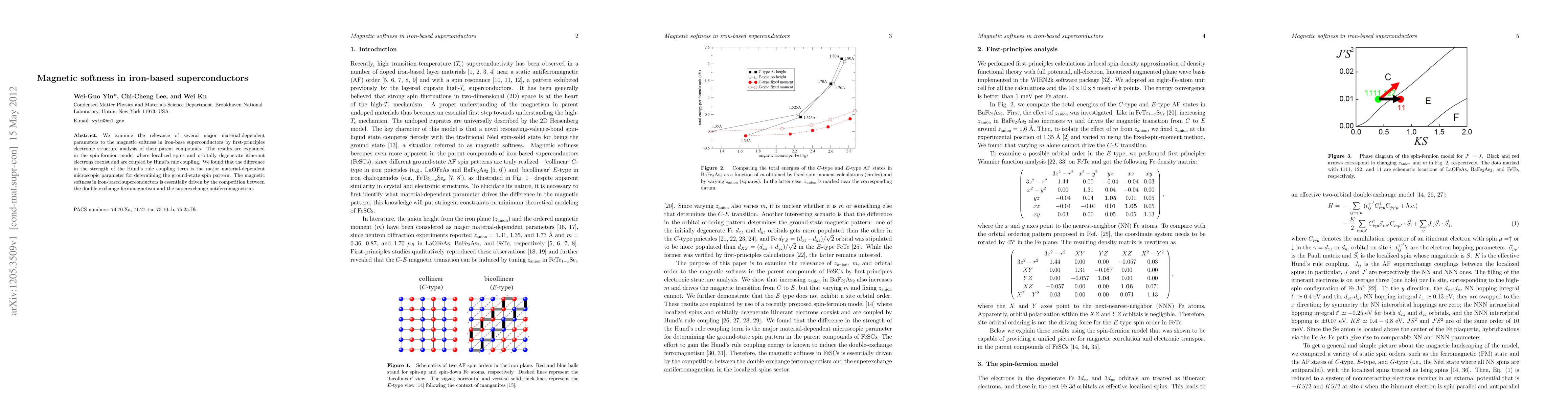 We examine the relevance of several major material-dependent parameters to the magnetic softness in iron-base superconductors by first-principles electronic structure analysis of their parent compounds. The results are explained in the spin-fermion model where localized spins and orbitally degenerate itinerant electrons coexist and are coupled by Hund's rule coupling. We found that the difference in the strength of the Hund's rule coupling term is the major material-dependent microscopic parameter for determining the ground-state spin pattern. The magnetic softness in iron-based superconductors is essentially driven by the competition between the double-exchange ferromagnetism and the superexchange antiferromagnetism.