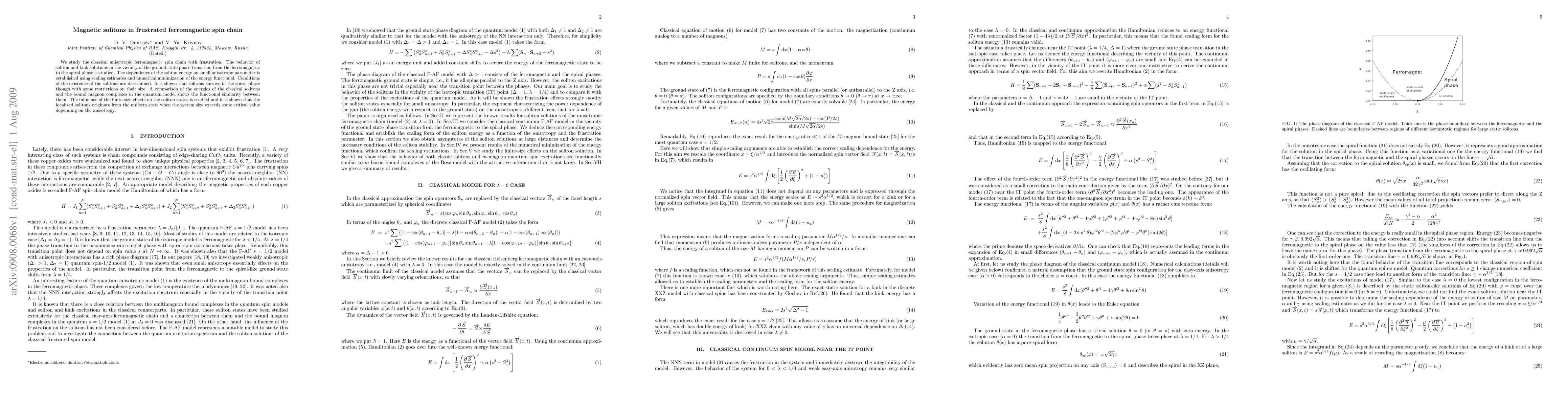 We study the classical anisotropic ferromagnetic spin chain with frustration. The behavior of soliton and kink solutions in the vicinity of the ground state phase transition from the ferromagnetic to the spiral phase is studied. The dependence of the soliton energy on small anisotropy parameter is established using scaling estimates and numerical minimization of the energy functional. Conditions of the existence of the solitons are determined. It is shown that solitons survive in the spiral phase though with some restrictions on their size. A comparison of the energies of the classical solitons and the bound magnon complexes in the quantum model shows the functional similarity between them. The influence of the finite-size effects on the soliton states is studied and it is shown that the localized solitons originate from the uniform state when the system size exceeds some critical value depending on the anisotropy.